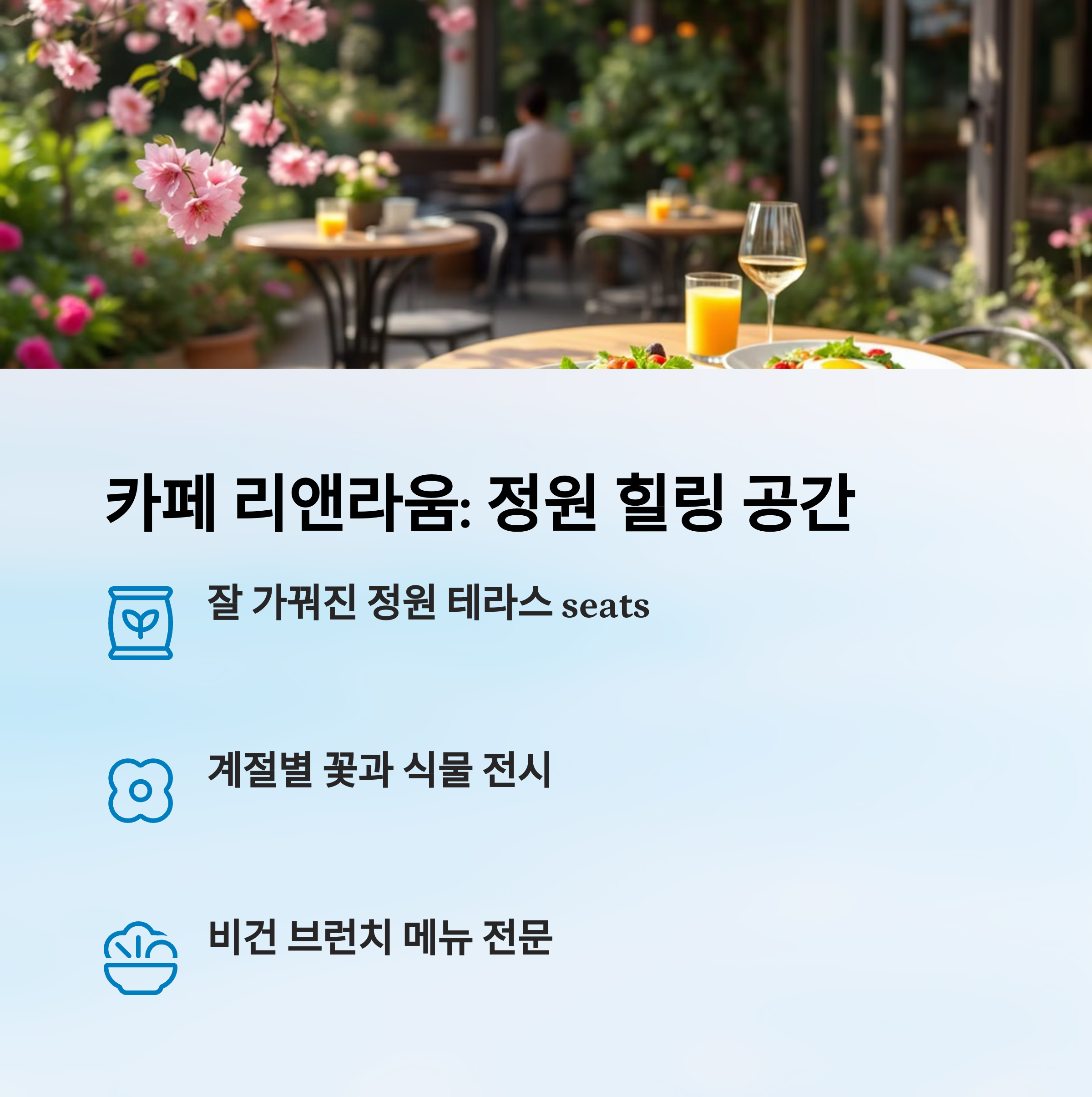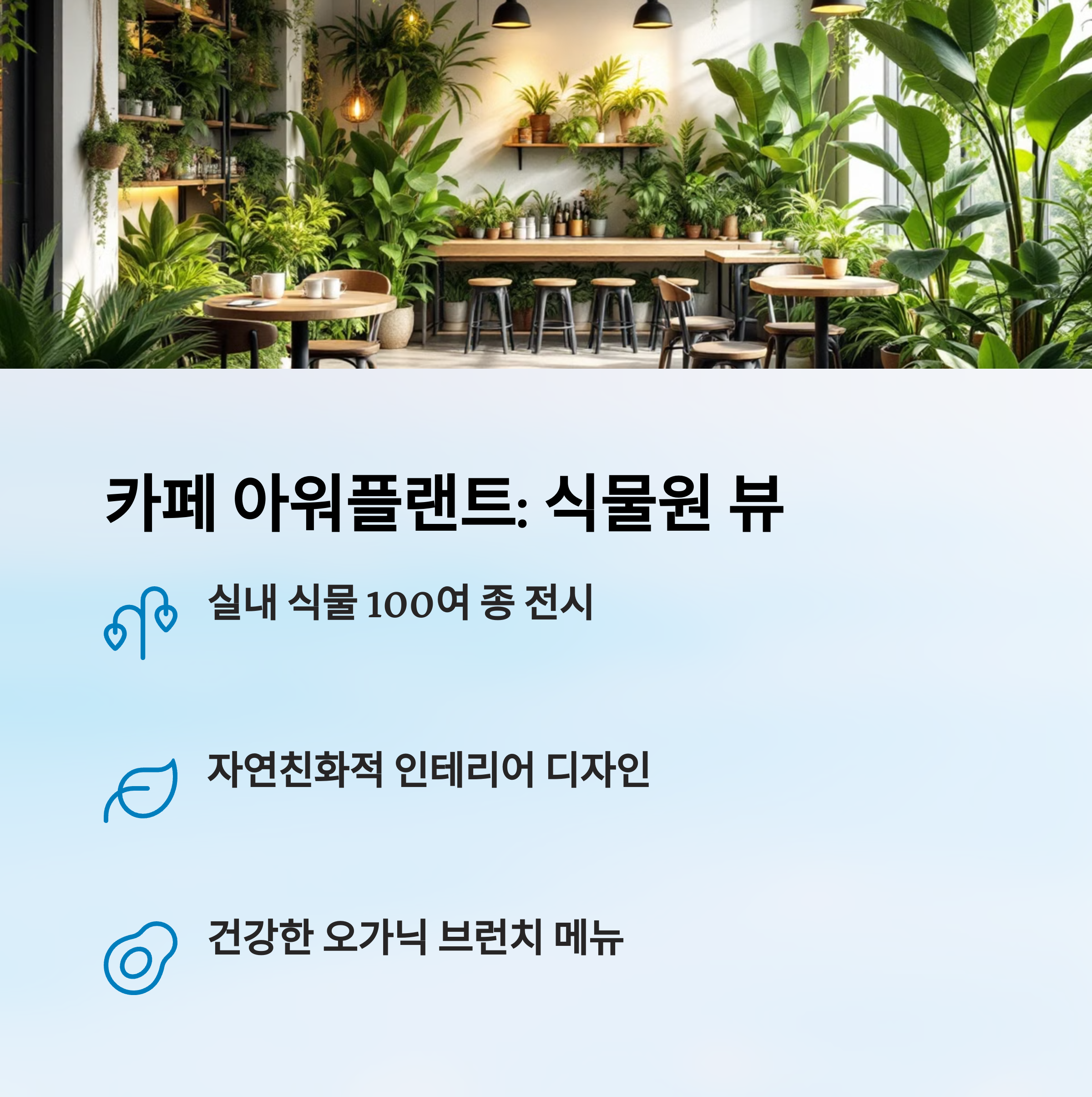 | 온실 카페 + 식물 테마 | 리코타샐러드, 오믈렛 | 혼카페족, 힐링러버 |