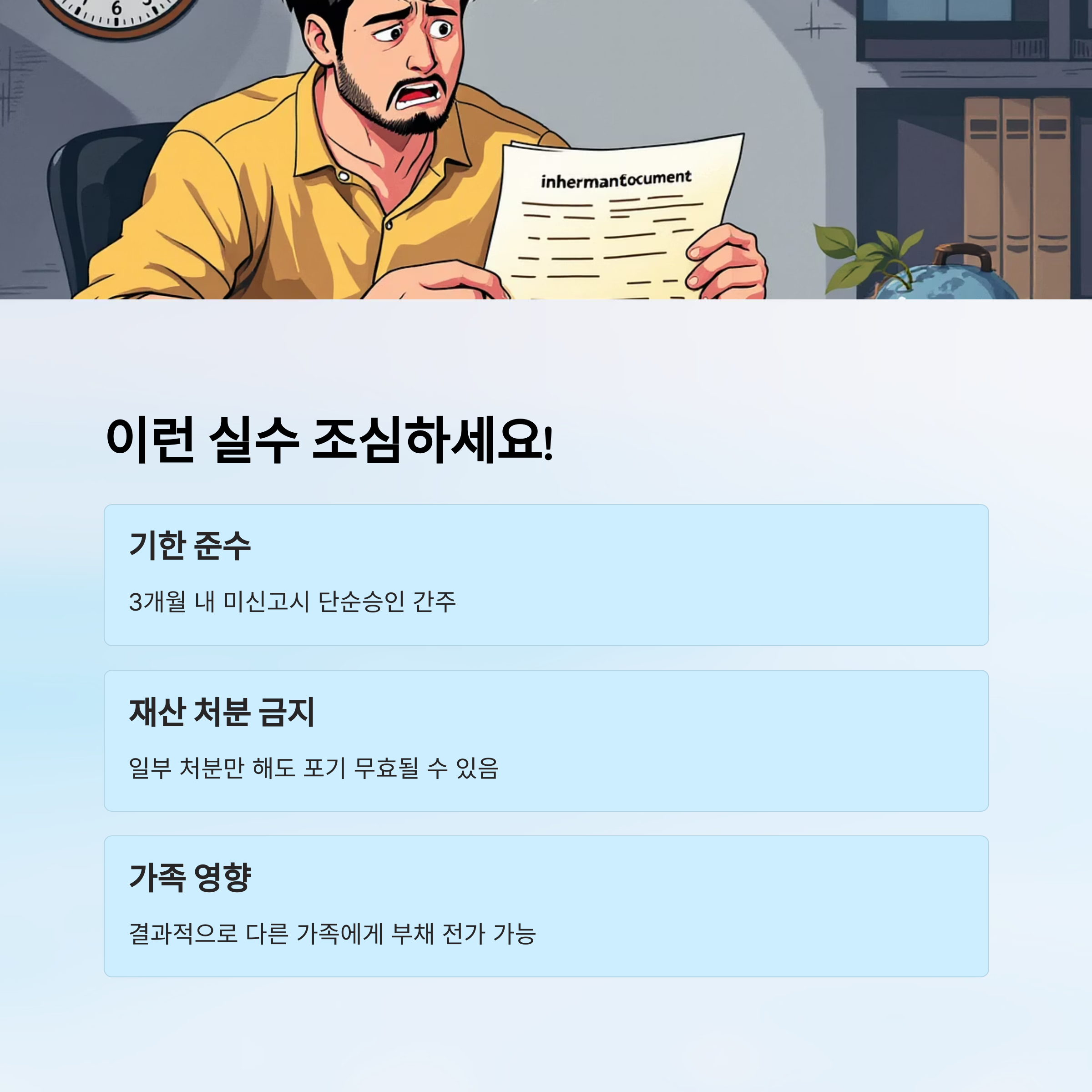 상속 포기는 법적으로 중요한 절차라서, 작은 실수 하나가 큰 손해로 이어질 수 있어요. 특히 무심코 하는 행동이 ‘상속 승인’으로 간주되는 경우가 많기 때문에 정말 조심해야 해요.