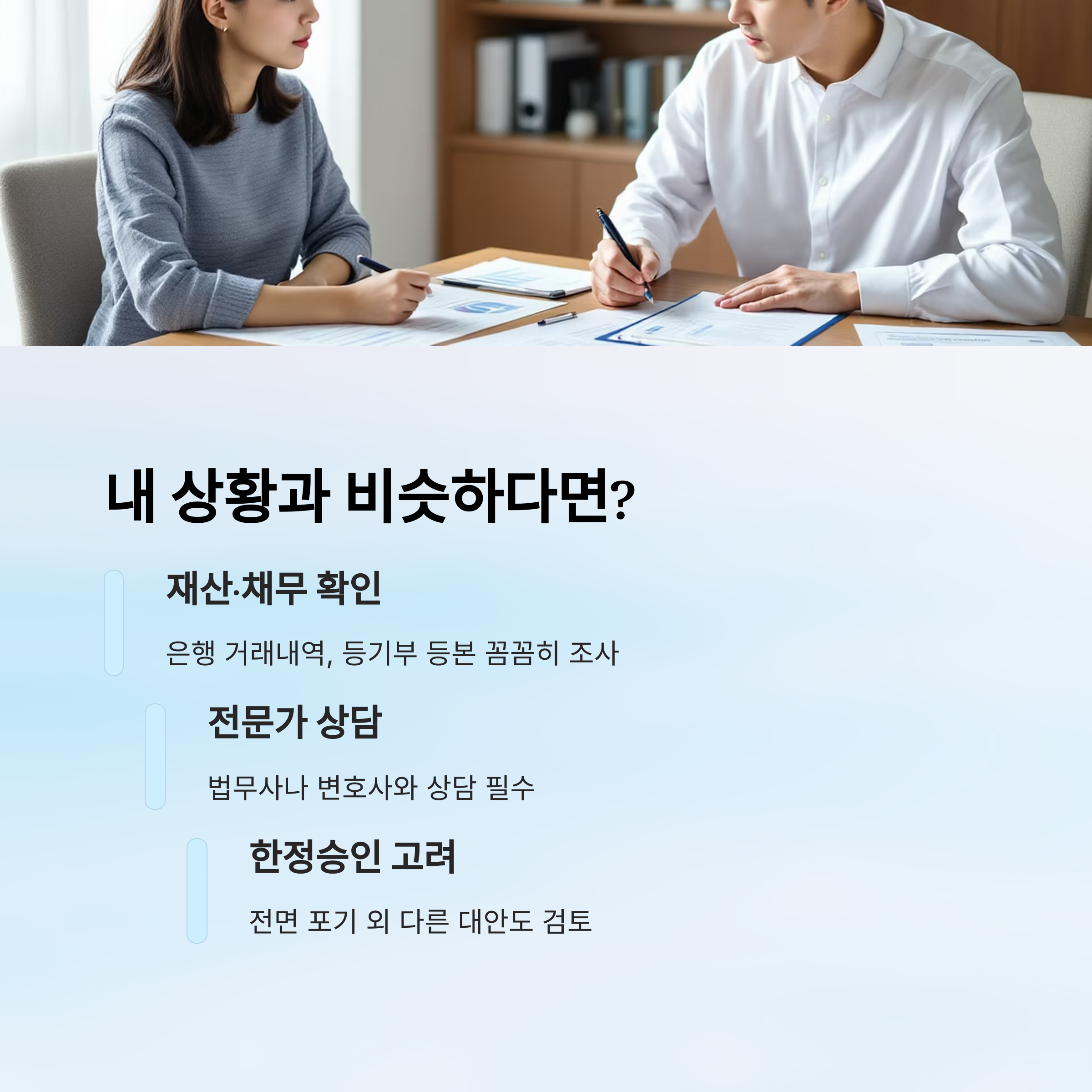 한정 승인을 고려하세요. 재산 한도 내에서 채무를 갚고 나머지는 책임지지 않는 방식이라 안전한 선택이에요.