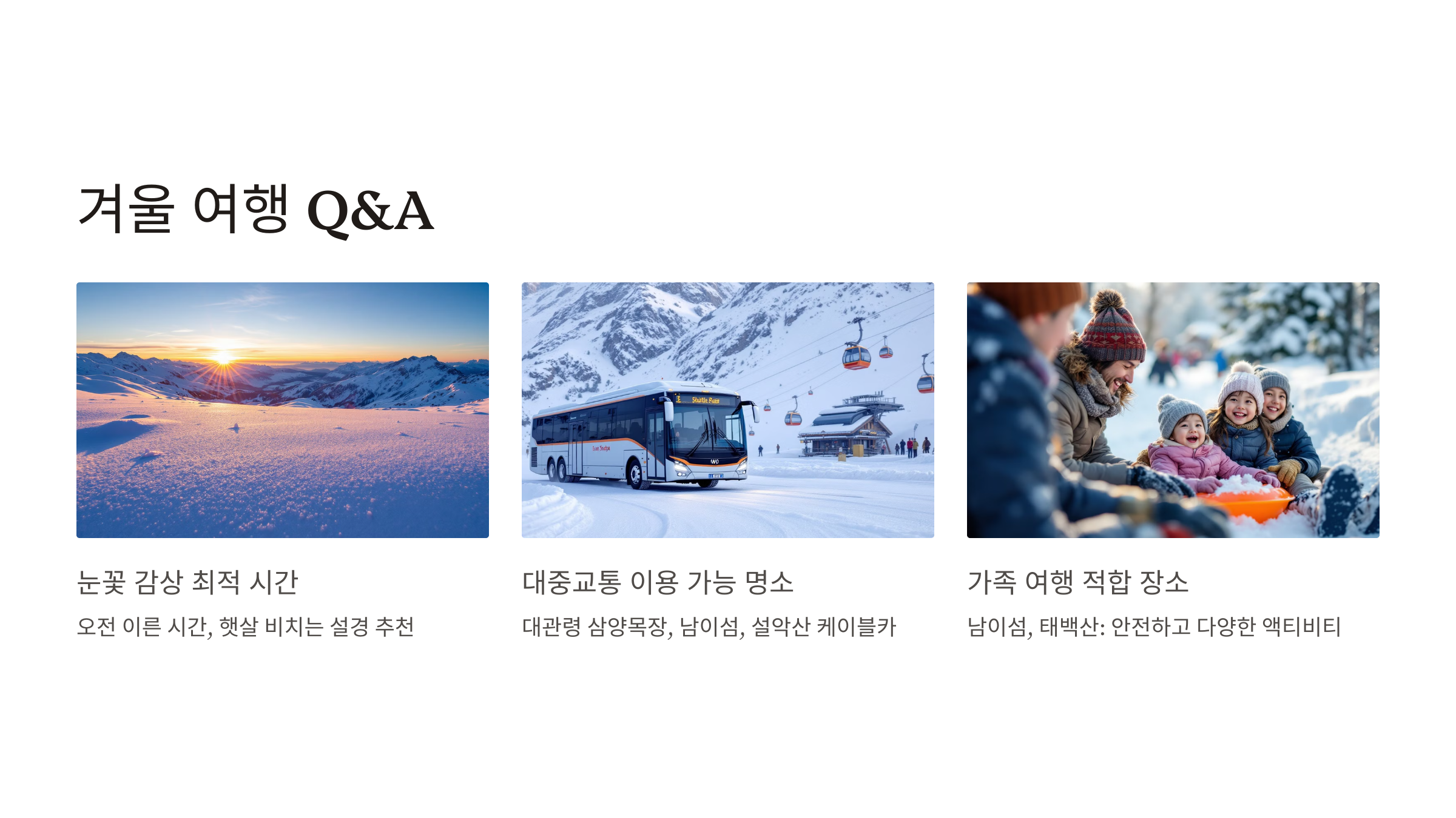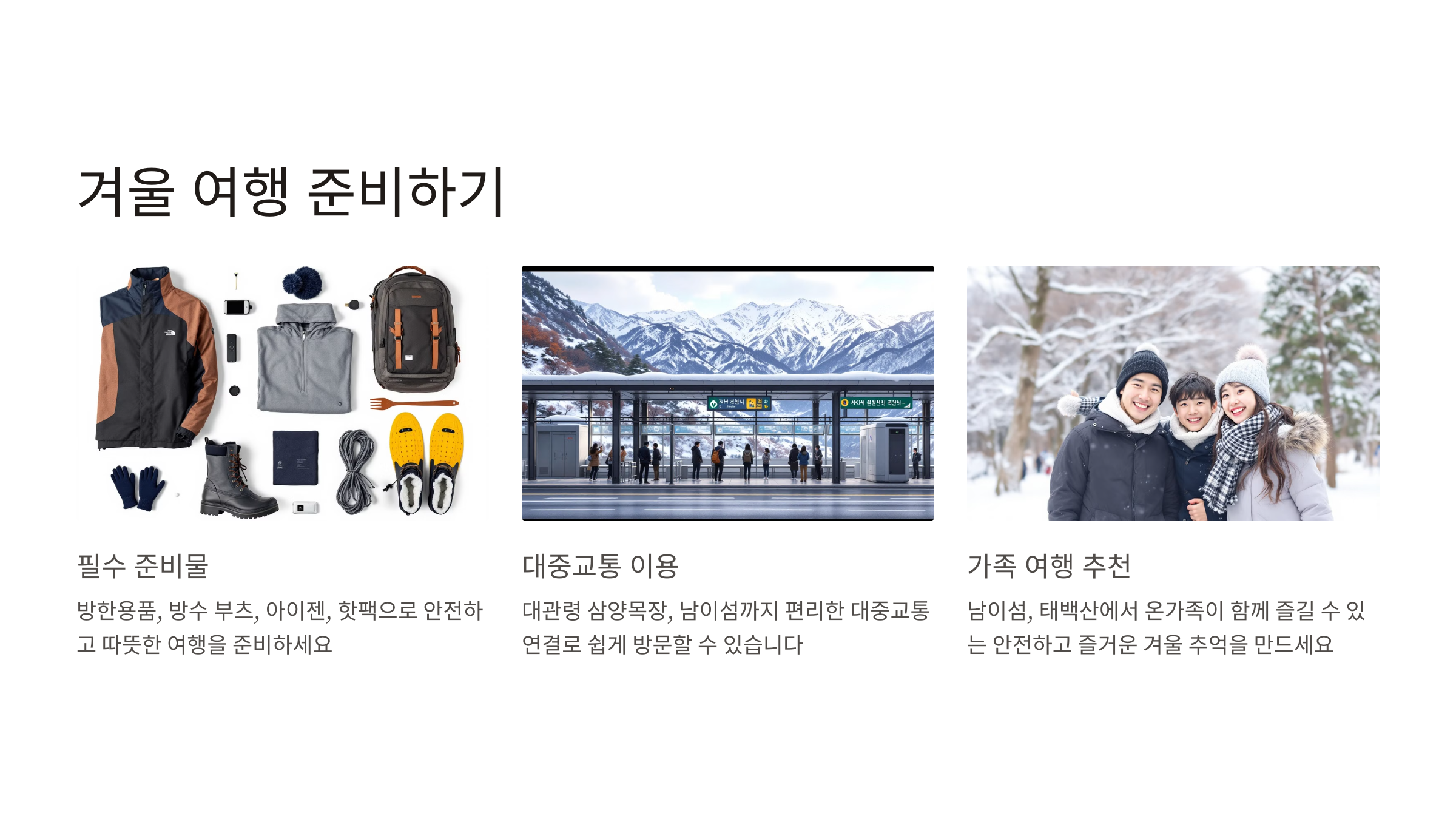 국내에는 이렇게 아름다운 겨울 여행지가 정말 많습니다. 이번 겨울에는 사랑하는 사람들과 함께 눈꽃이 만발한 명소로 여행을 떠나보는 건 어떨까요? 소개된 다섯 곳 모두 각기 다른 매력을 가지고 있으니, 여러분의 취향에 따라 여행지를 선택해보세요. 설경을 보며 따뜻한 커피 한 잔을 즐기는 순간은 분명 오래도록 기억에 남을 거예요. 지금 바로 겨울 여행을 계획해 보세요! 🗺️