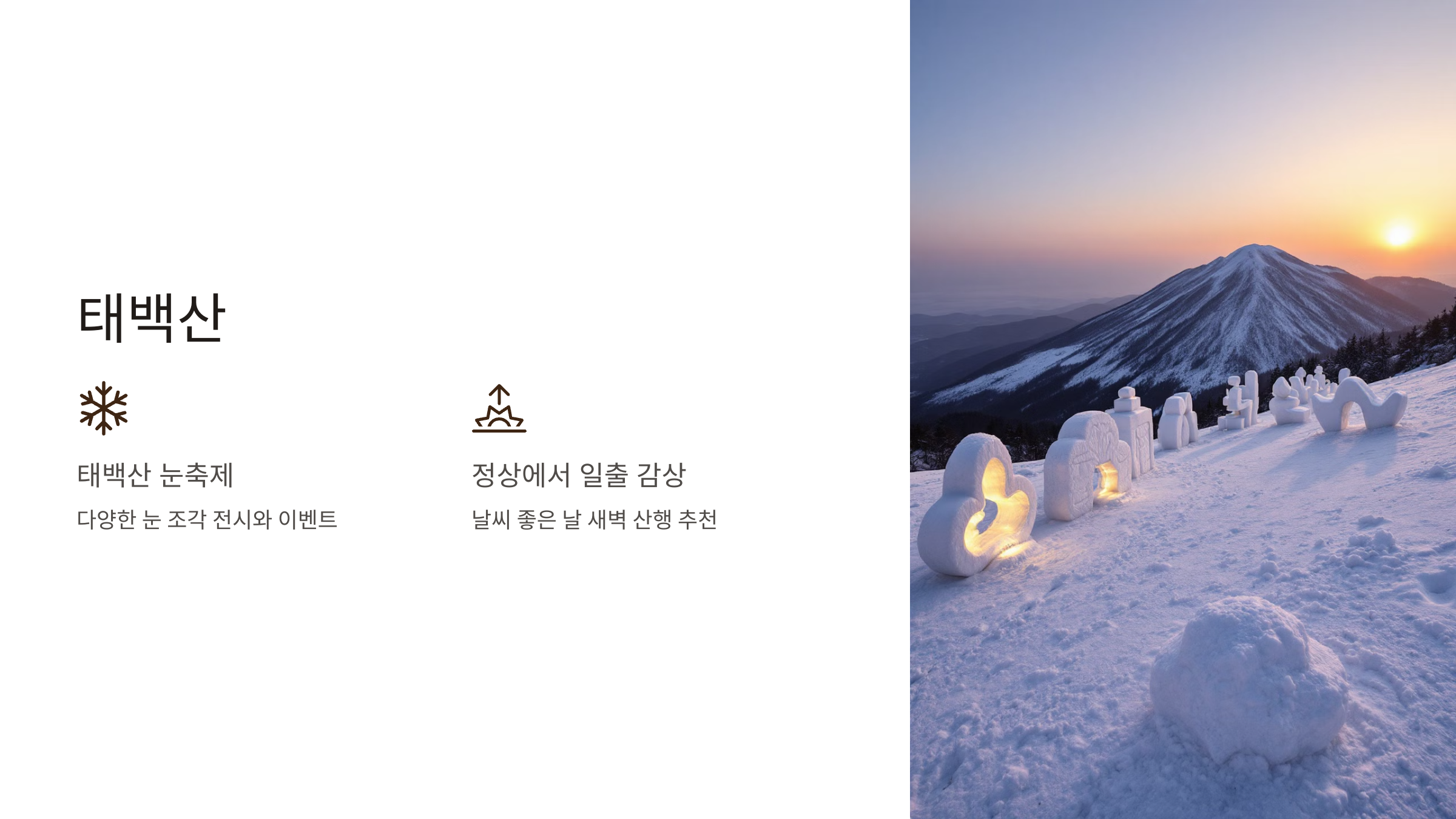 태백산은 겨울철 눈꽃 여행지로 항상 빠지지 않는 명소입니다. 특히 매년 열리는 태백산 눈축제에서는 다양한 눈 조각 전시와 이벤트를 즐길 수 있어요. 또한, 태백산 정상에서 바라보는 눈 덮인 풍경은 잊지 못할 추억을 선사합니다.