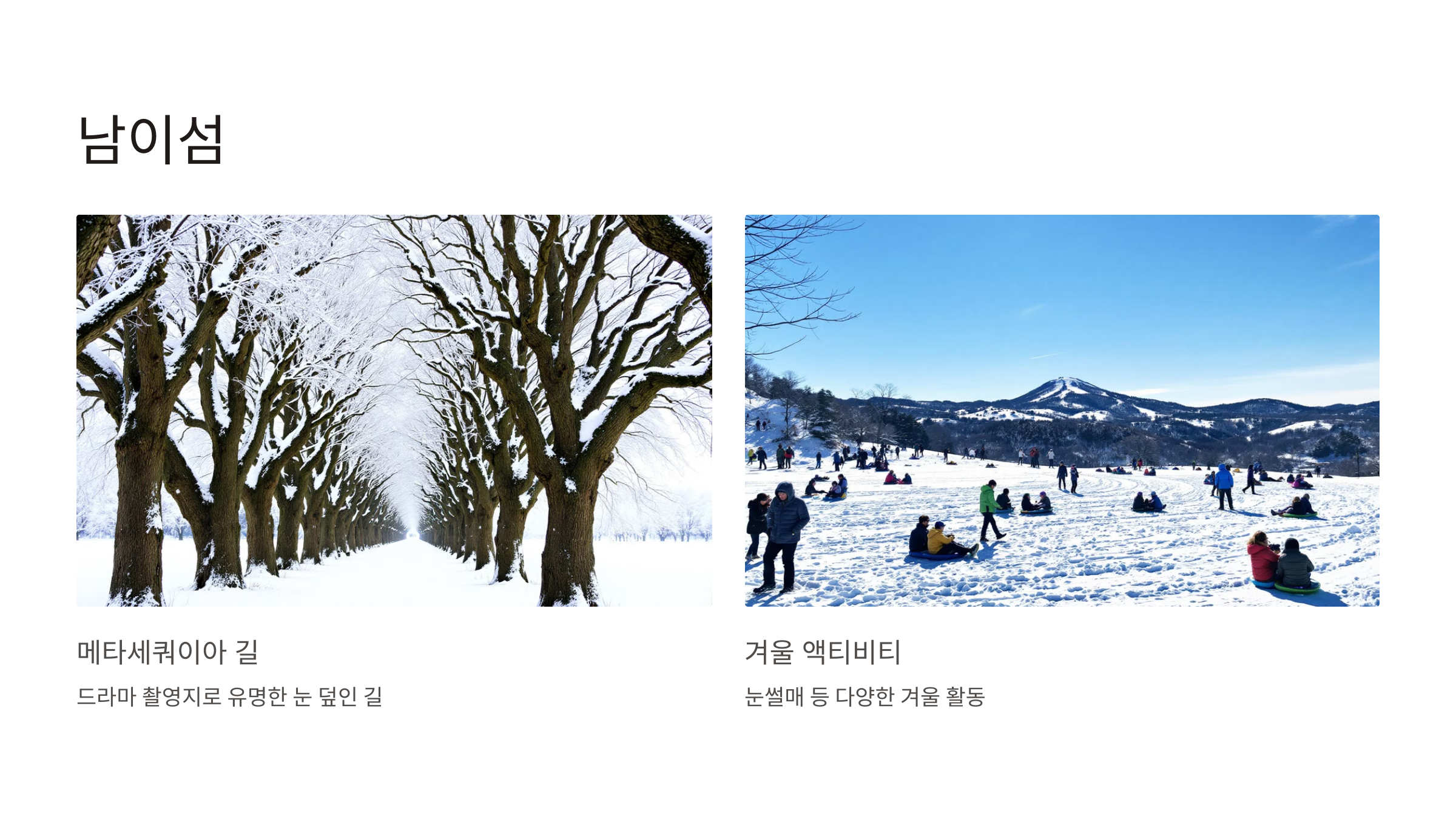 남이섬은 사계절 내내 아름답지만, 겨울철에는 눈 덮인 은행나무길과 메타세쿼이아 길이 압권입니다. 이곳은 연인들의 데이트 명소로도 유명하고, 가족 단위 여행객에게도 인기 있는 여행지입니다. 눈 내린 남이섬에서 동화 같은 하루를 보내보세요!