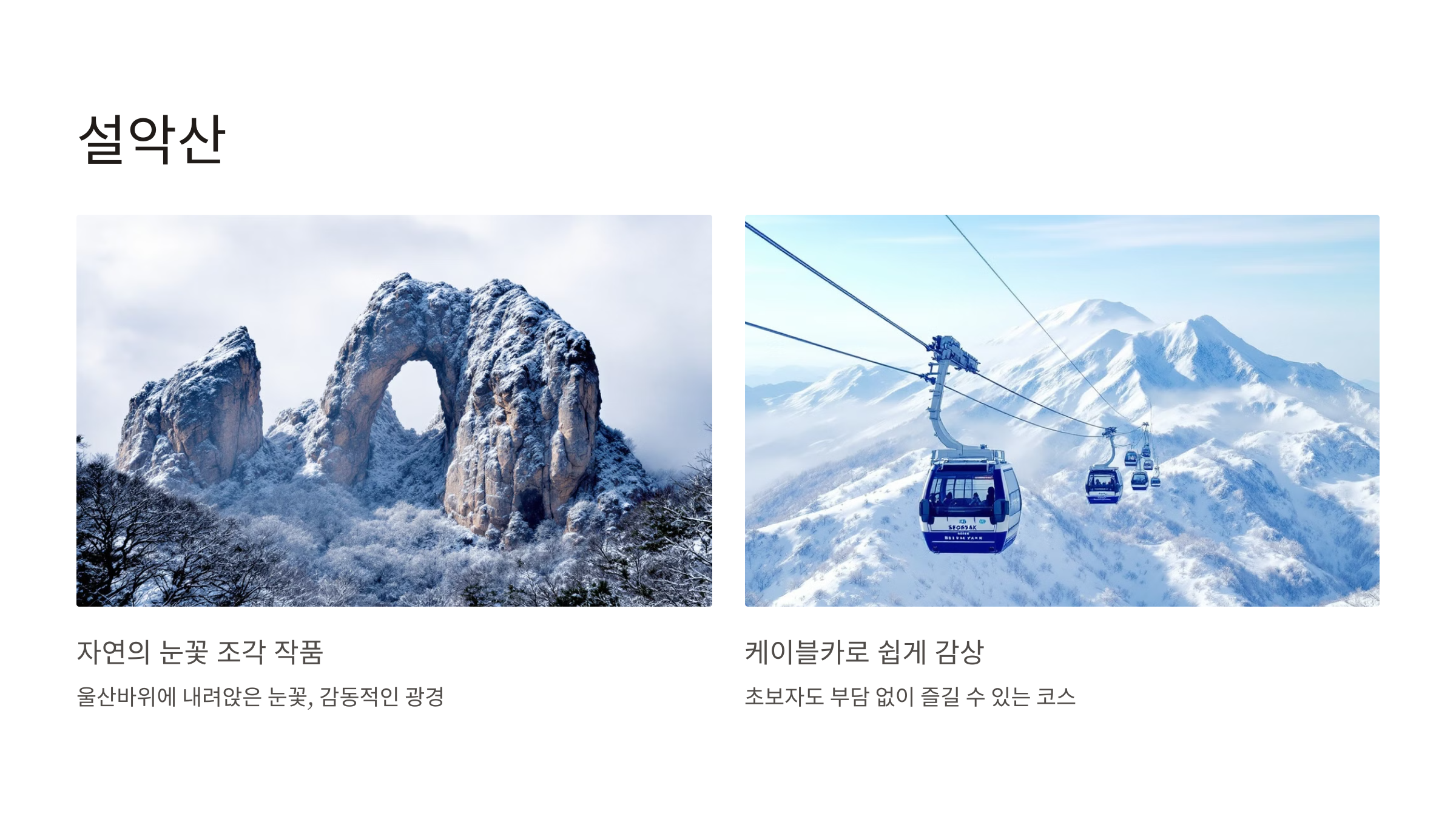 겨울의 설악산은 거대한 눈꽃 조각 전시회를 방불케 합니다. 특히, 설악산 울산바위에 내려앉은 눈꽃은 많은 이들에게 감동을 선사합니다. 케이블카를 타고 올라가면 산 전체가 새하얀 눈으로 뒤덮인 모습을 한눈에 감상할 수 있답니다.