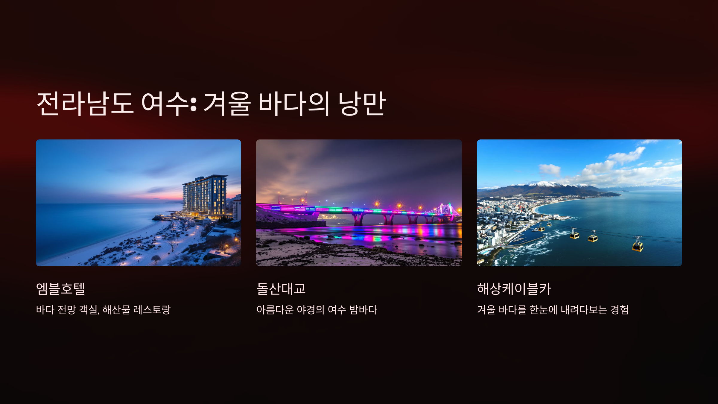 - 돌산대교: 야경이 아름다운 명소로, 여수 밤바다를 감상할 수 있습니다.