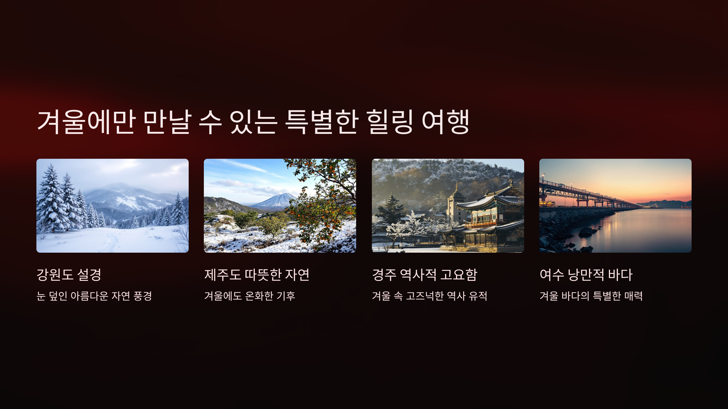 겨울은 여행지마다 다른 매력을 선사하는 특별한 계절입니다. 강원도의 설경, 제주도의 따뜻한 자연, 경주의 역사적인 고요함, 여수의 낭만적인 바다, 인제의 자연 속 평화로움까지. 소개한 숙소와 명소는 올겨울, 당신의 힐링 여행을 완성시켜줄 것입니다. 올겨울에는 마음과 몸이 따뜻해지는 여행을 떠나보세요. 🛷☕