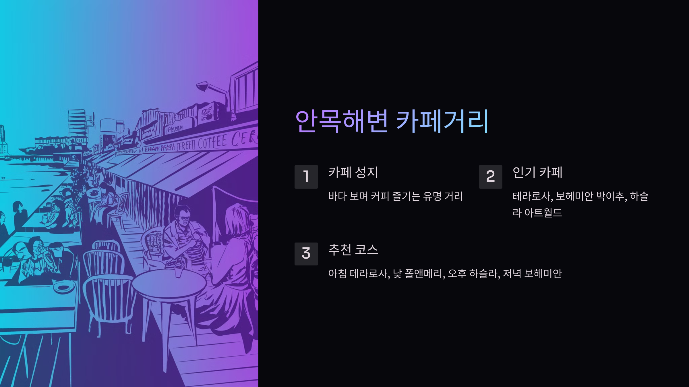 | 카페 바다뷰 | 해변 바로 앞 위치 | 플랫화이트, 카푸치노 |
