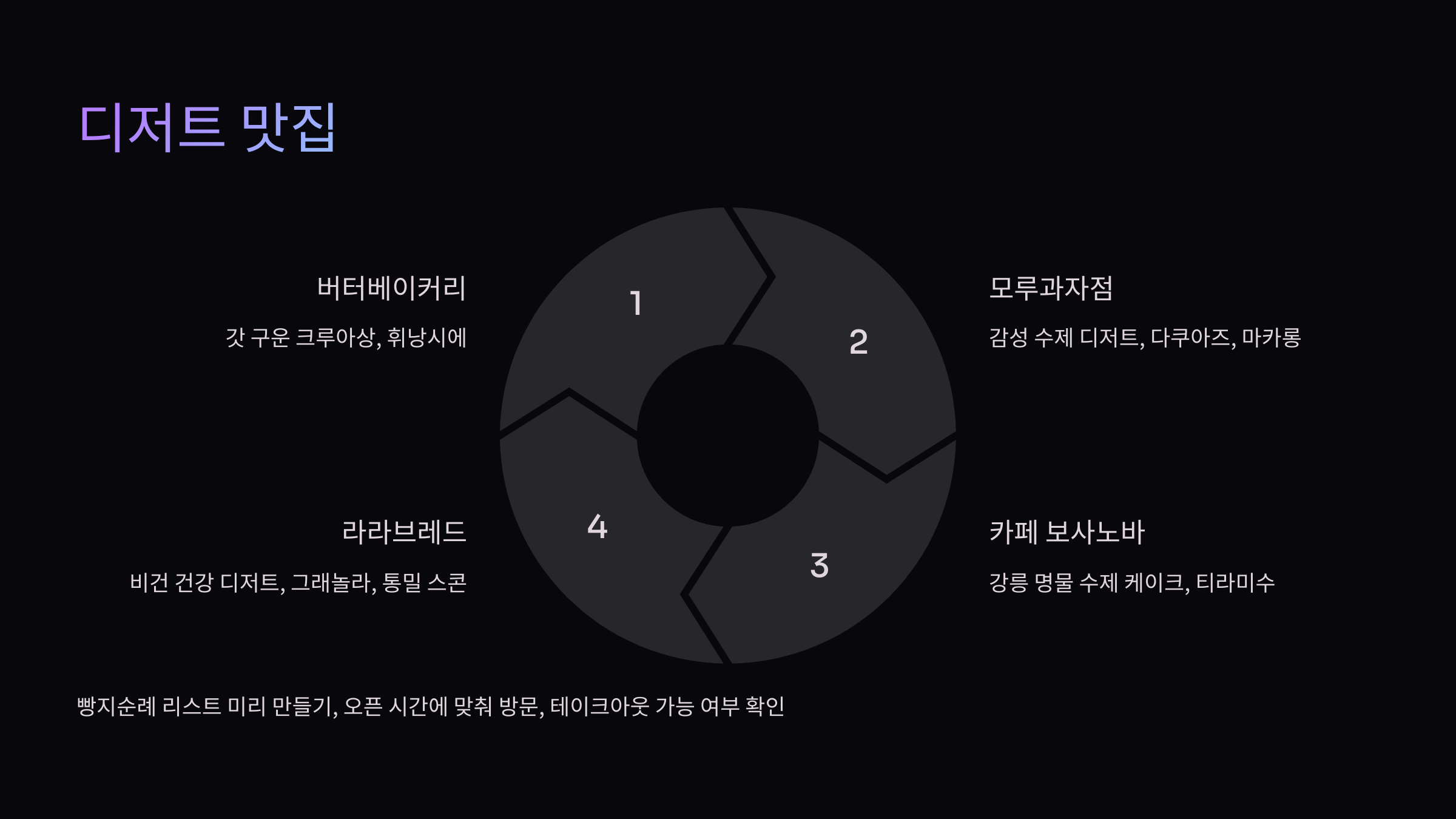 A6. **버터베이커리, 모루과자점, 카페 보사노바** 등이 디저트 맛집으로 유명해요. 크루아상과 티라미수가 특히 인기예요! 🍰