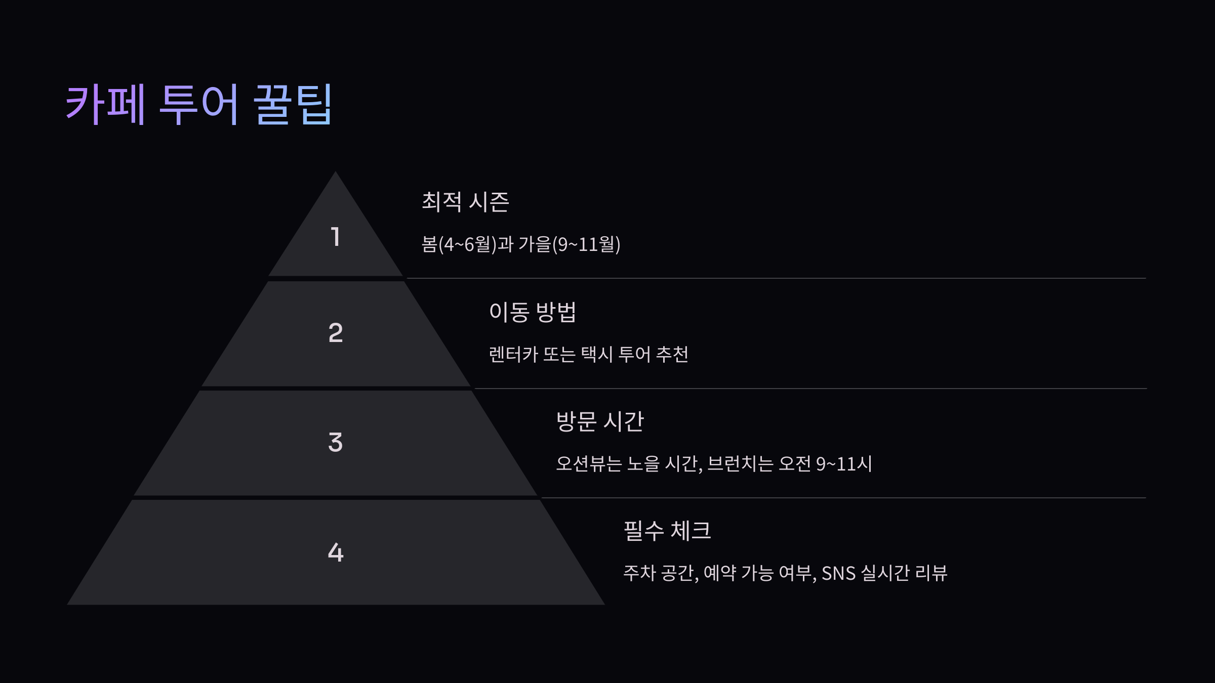 A7. 대중교통보다는 **렌터카 or 택시 투어**가 편리해요! 카페들이 흩어져 있어서 차량 이동이 필수예요. 🚗