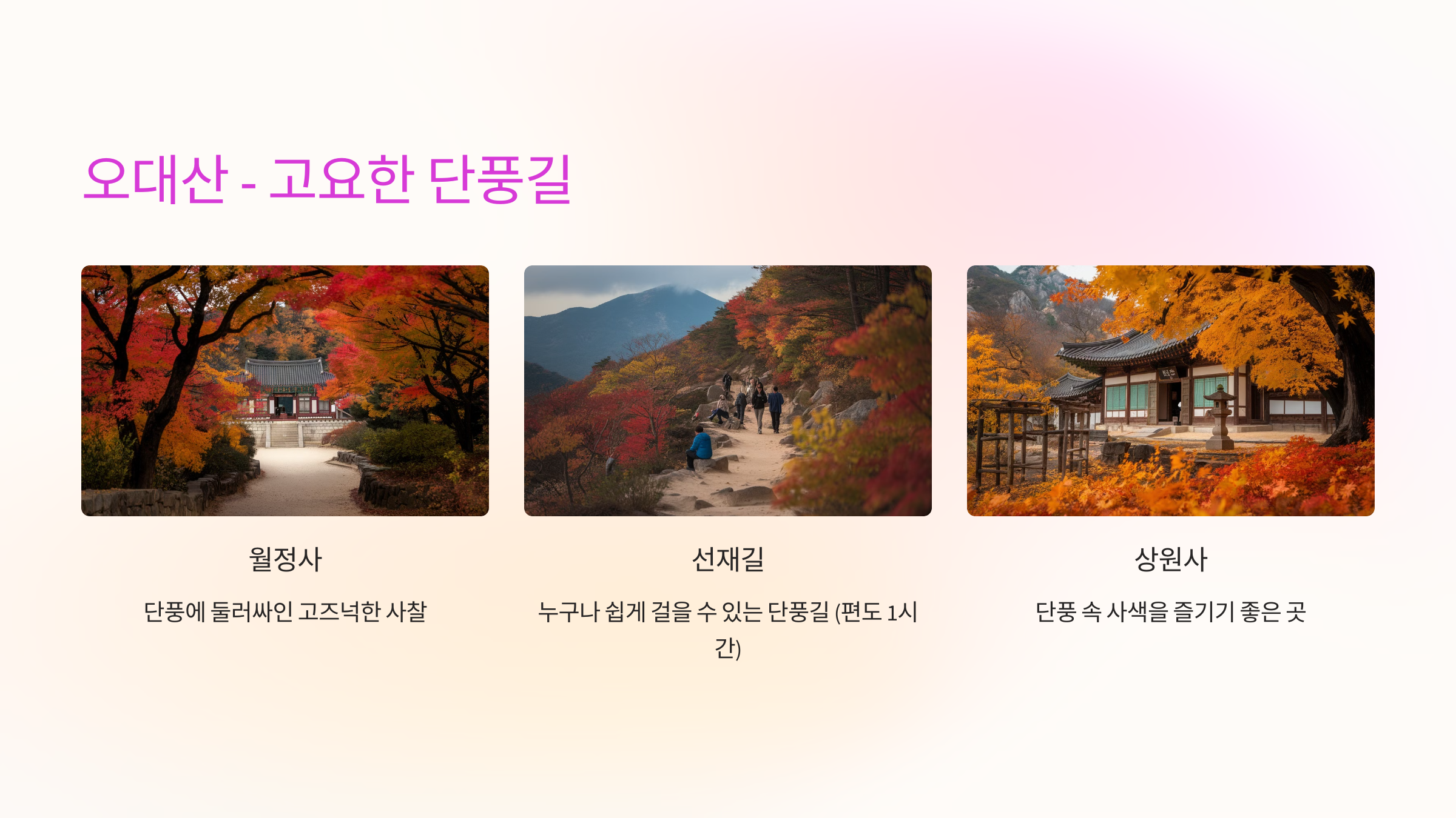 - 특징: 오대산은 조용하고 평화로운 단풍 명소로, 걷기 좋은 트레킹 코스가 많아 가족 단위 여행객에게 추천됩니다. 선재길과 월정사의 단풍길이 특히 아름답습니다.