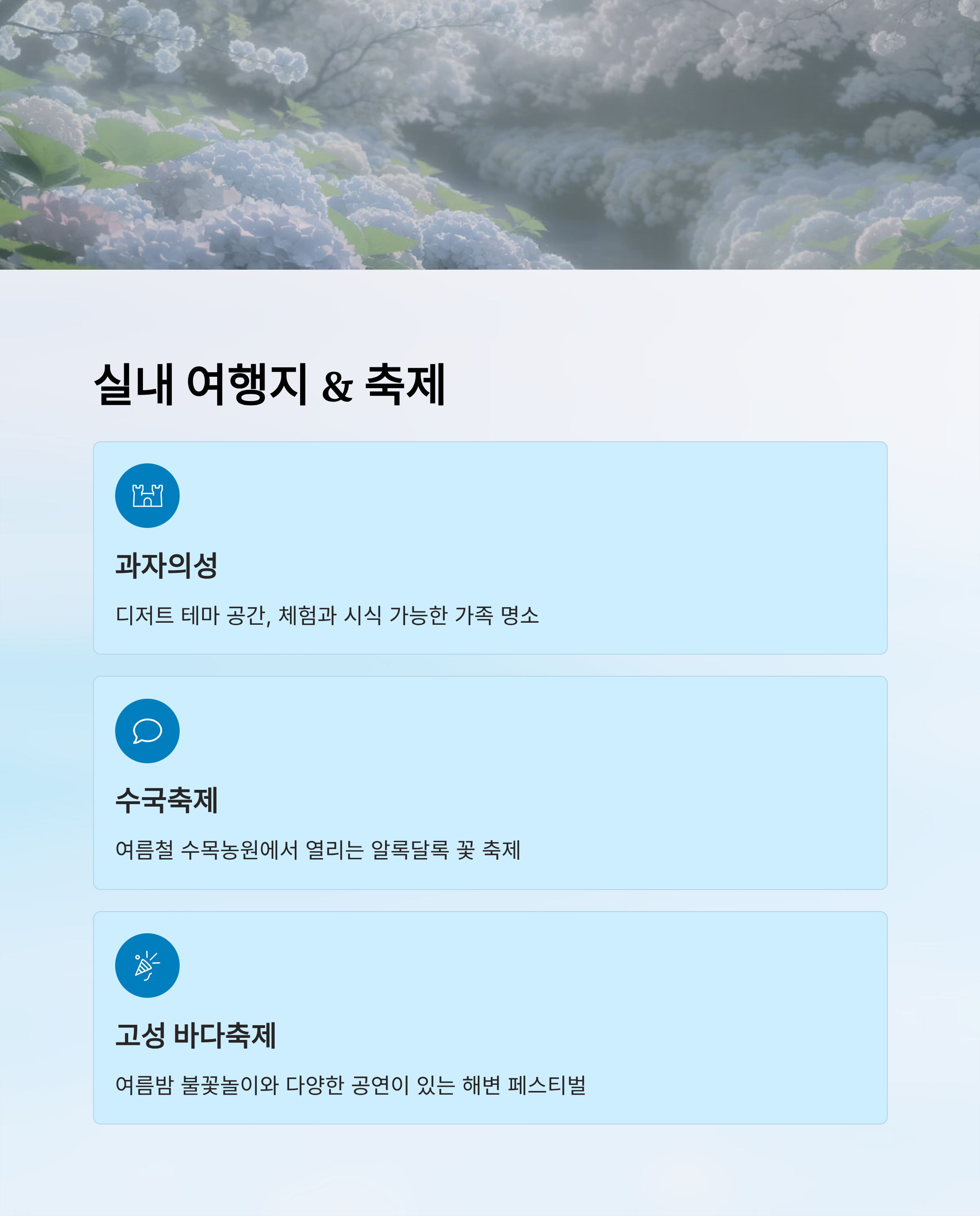 | 가족 | 속초수목원 → 영랑호 → 수국축제 | 체험형 여행 | 여름 | 아이 동반 |
