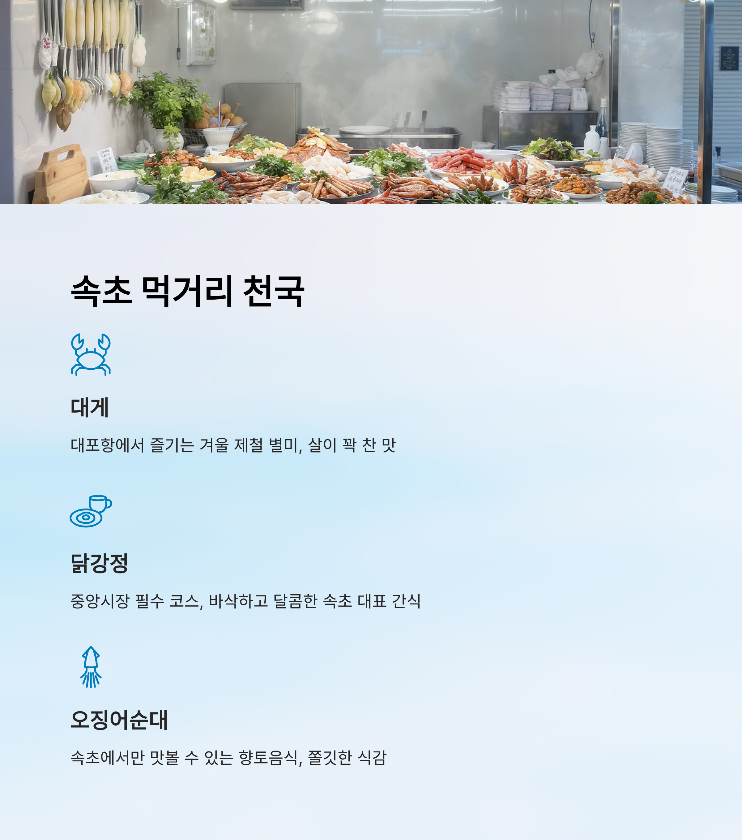 속초 여행에서 빼놓을 수 없는 건 바로 먹거리예요. 바닷가 도시답게 신선한 해산물이 풍부하고, 속초만의 특색 있는 음식들이 많아 여행객들에게 큰 즐거움을 주죠. 대표적으로 대게와 회, 오징어순대, 닭강정이 유명해요. 🦀