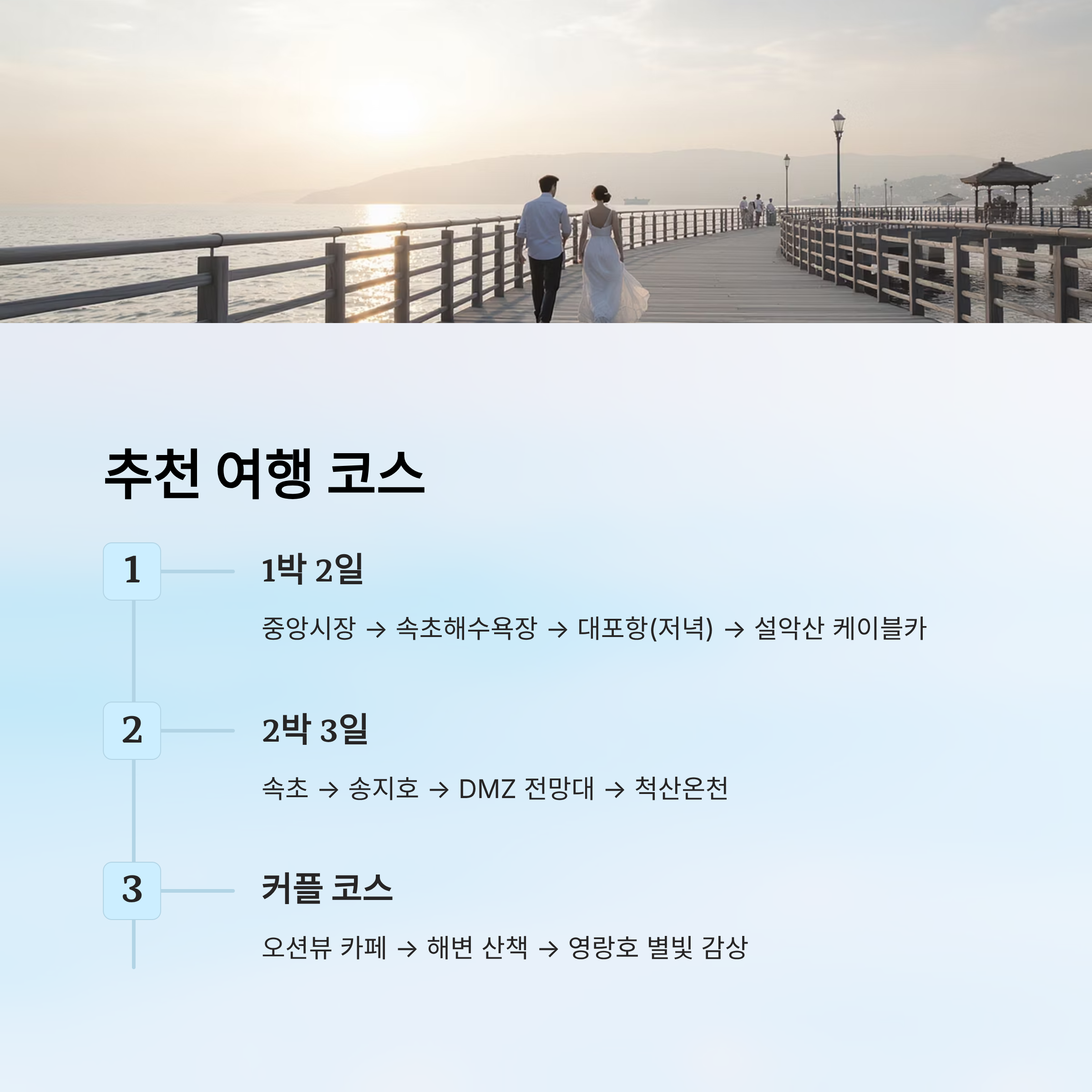 | 커플 | 속초 카페 → 해변 산책 → 영랑호 별빛 | 로맨틱한 코스 | 봄·가을 | 데이트 |