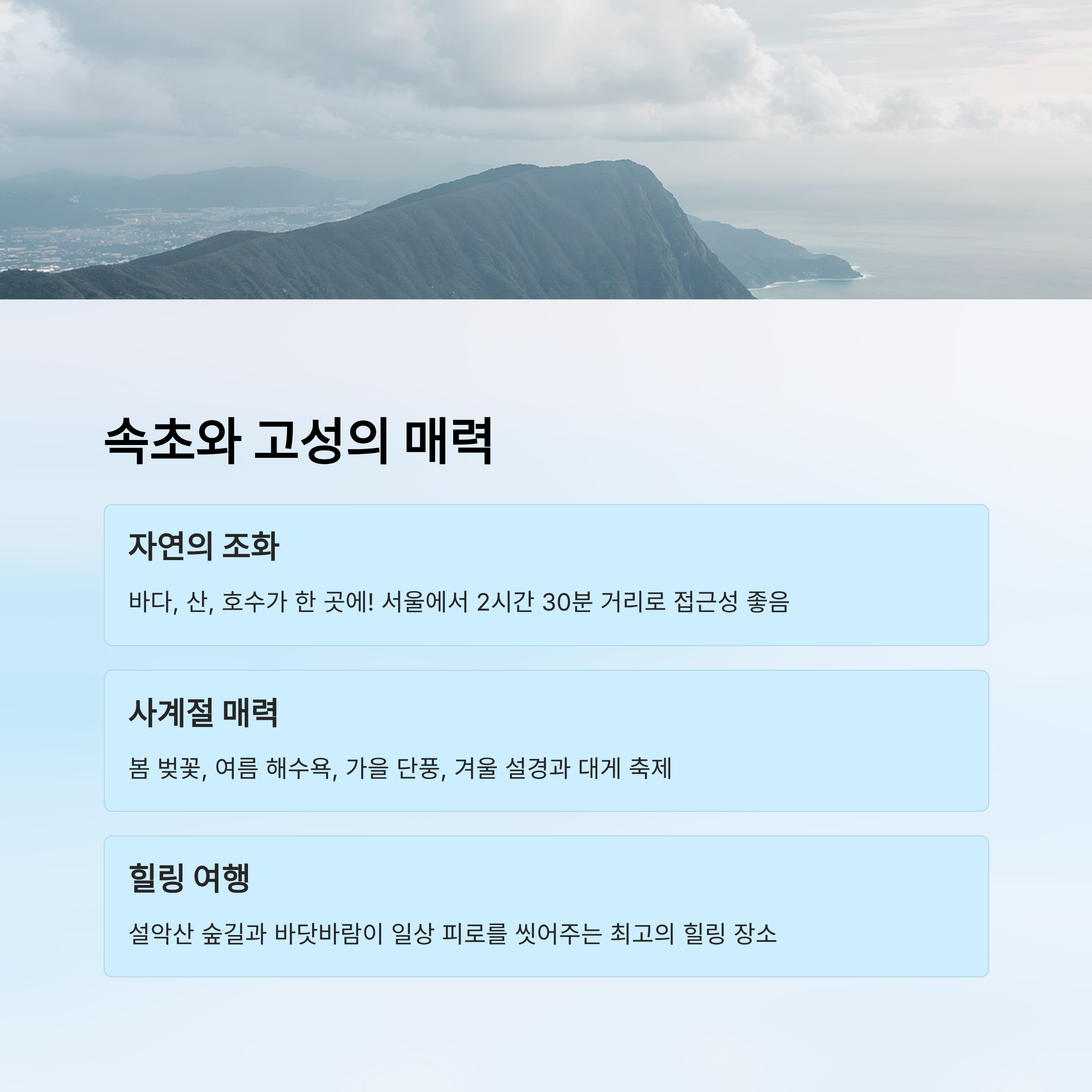 | 속초 | 바다·산·시장 모두 가까움 | 여름·가을 | 속초해수욕장, 중앙시장 | 도심·맛집 탐방 |