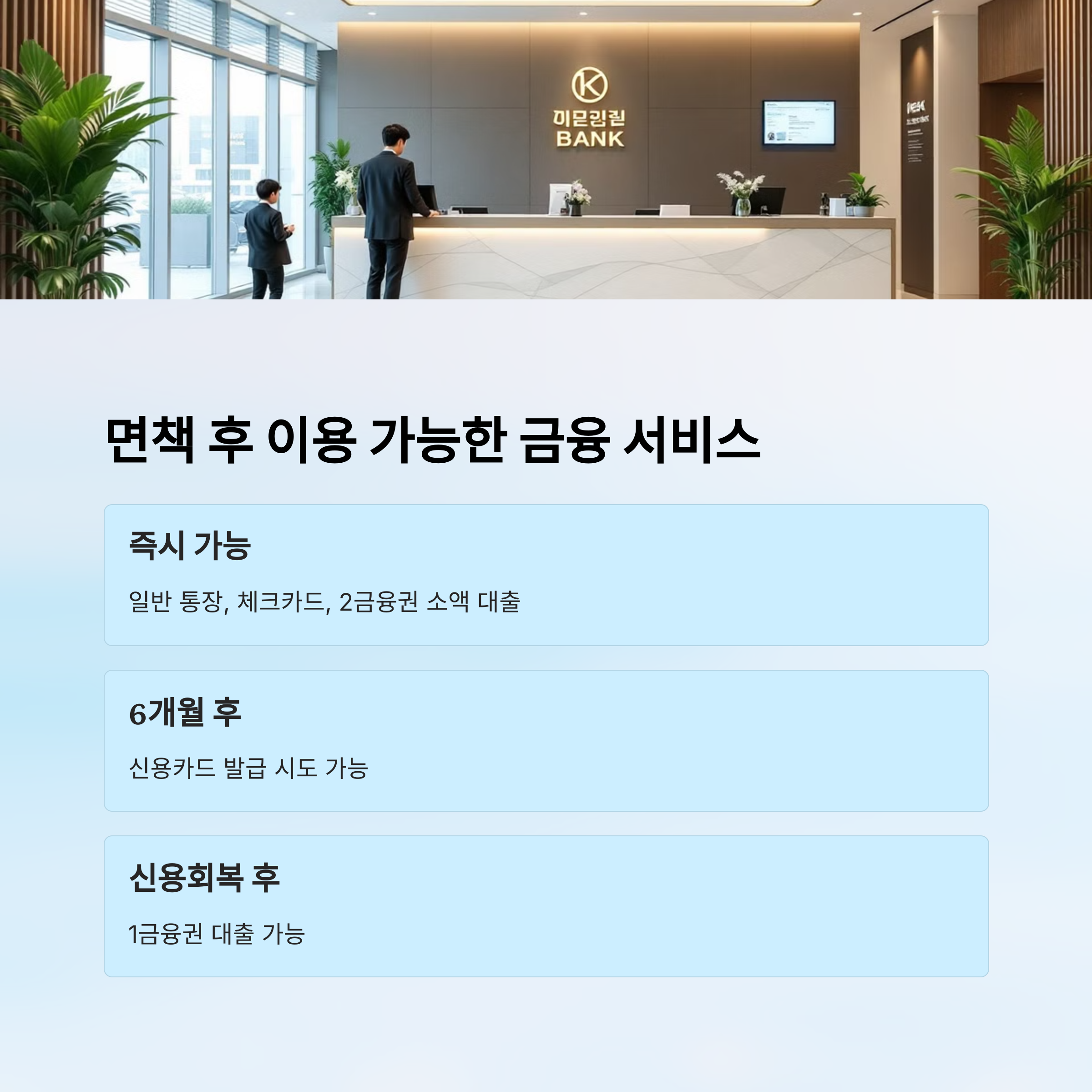 면책 이후에는 일시적으로 금융상품 가입, 신용카드 발급, 대출 등이 어려워요. 하지만 생활에 꼭 필요한 체크카드나 일부 보증형 상품은 사용할 수 있어요. 금융활동의 '기본 틀'은 유지할 수 있다는 거죠.