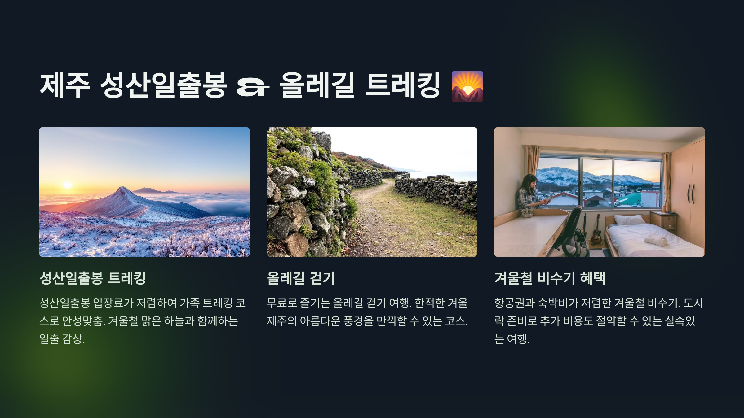 - 겨울철은 비수기로 제주 항공권과 숙박비가 저렴합니다.
