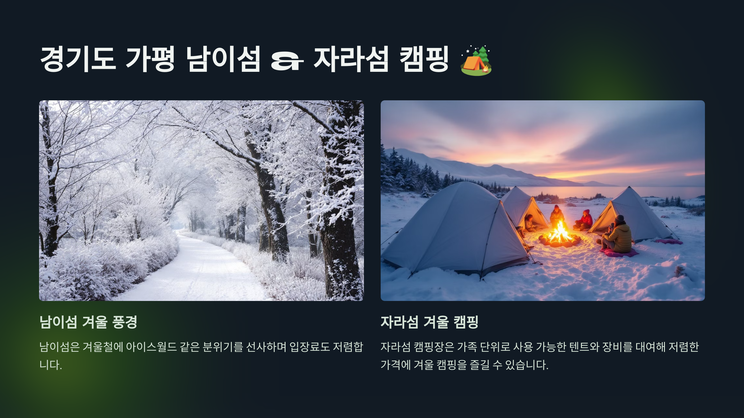 - 자라섬 캠핑장은 가족 단위로 사용 가능한 텐트와 장비를 대여해 저렴한 가격에 겨울 캠핑을 즐길 수 있습니다.