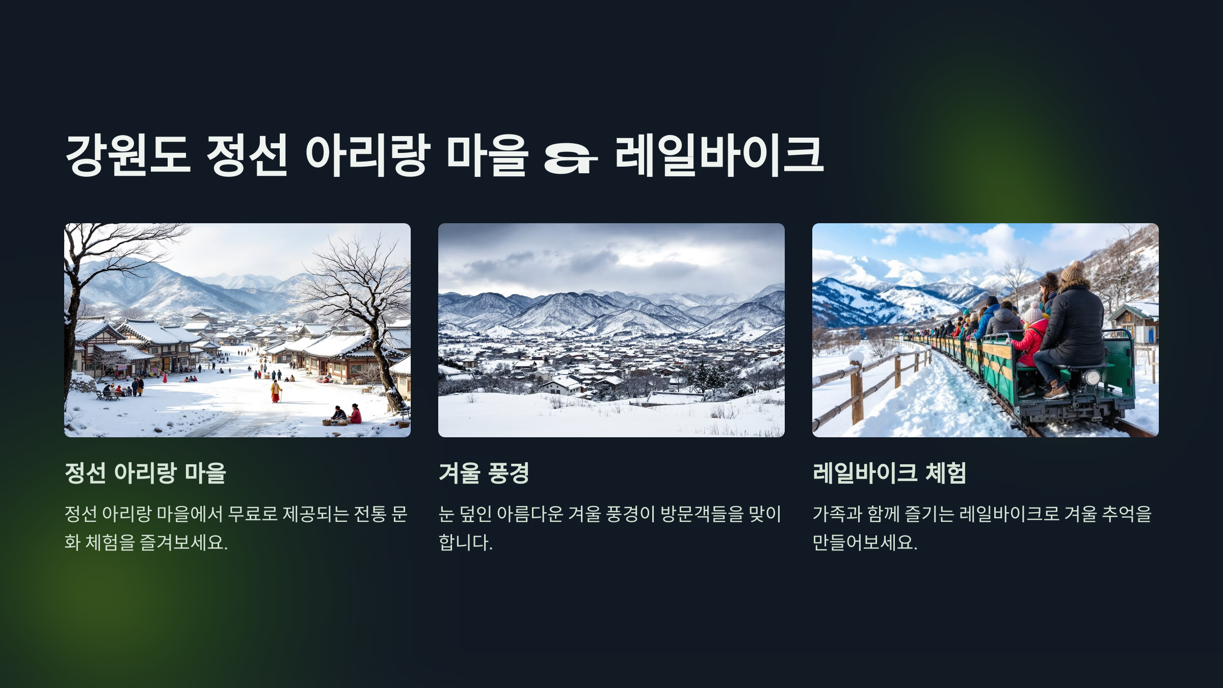 - 정선 아리랑 마을은 문화 체험이 무료로 제공되며, 눈 덮인 겨울 풍경이 아름답습니다.