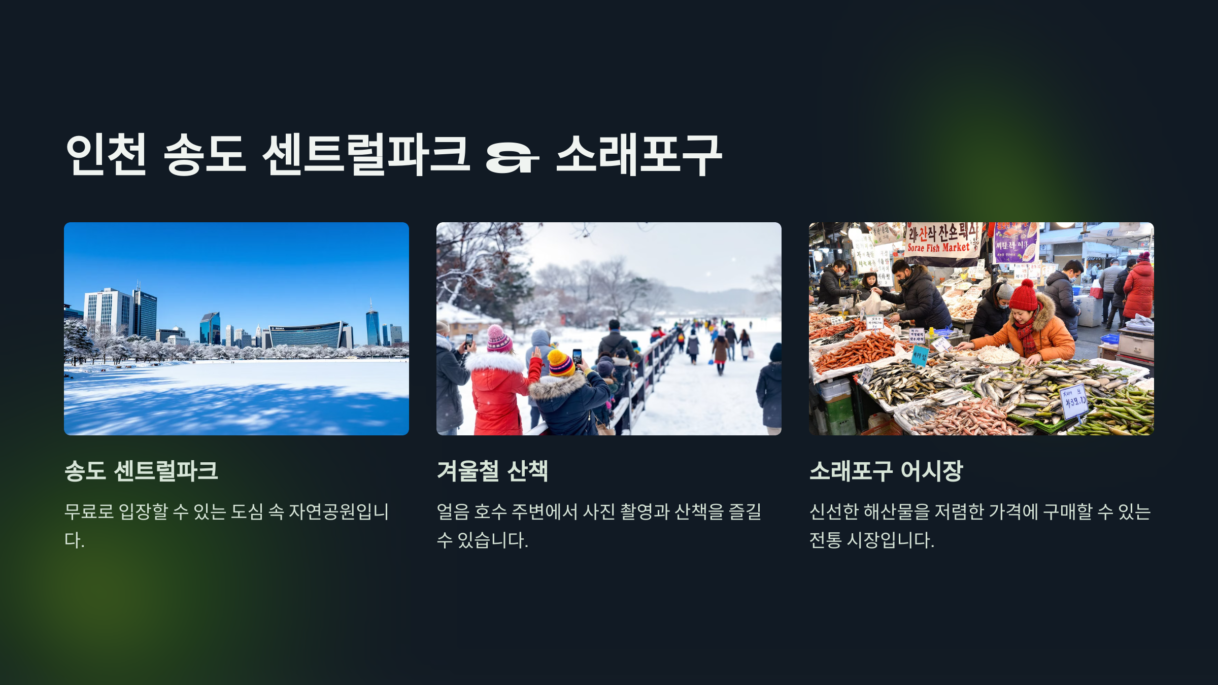 - 송도 센트럴파크는 무료로 이용할 수 있는 넓은 공원으로, 겨울철 얼음이 어는 호수 주변에서 사진을 찍거나 산책하기 좋습니다.