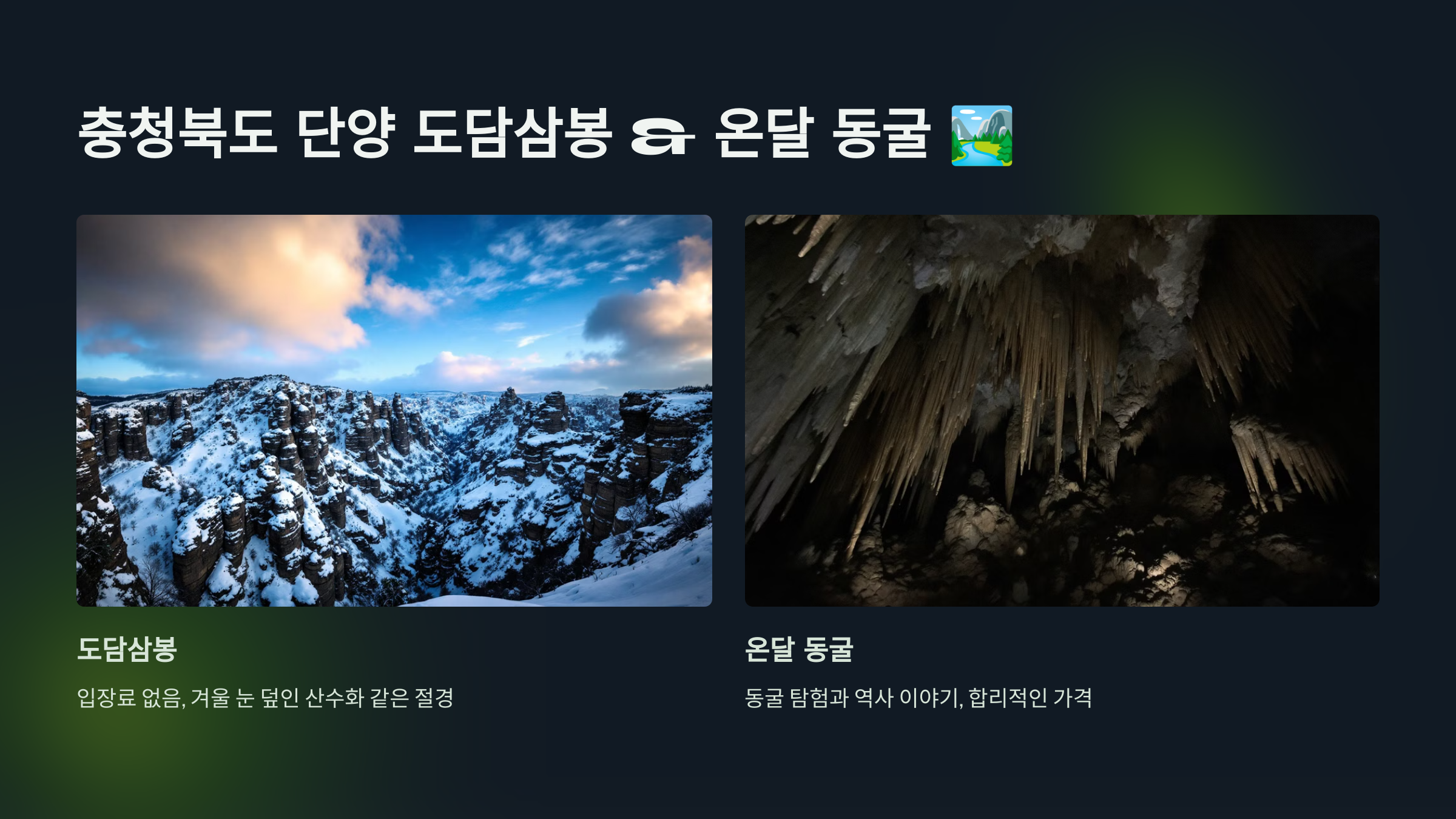 - 온달 동굴은 합리적인 가격으로 동굴 탐험과 역사 이야기를 즐길 수 있어요.
