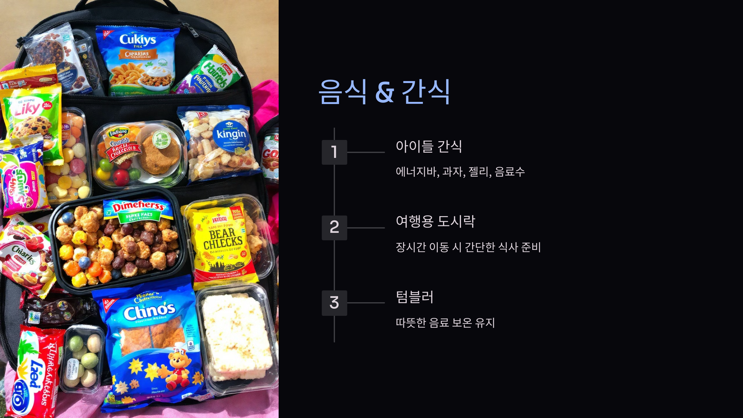 - 비상 간식 & 물병: 아이들이 언제든 먹을 수 있도록 준비