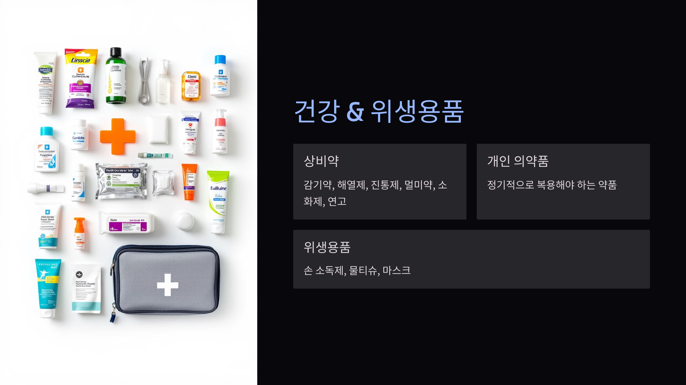 - 상비약: 감기약, 해열제, 진통제, 멀미약, 소화제, 연고