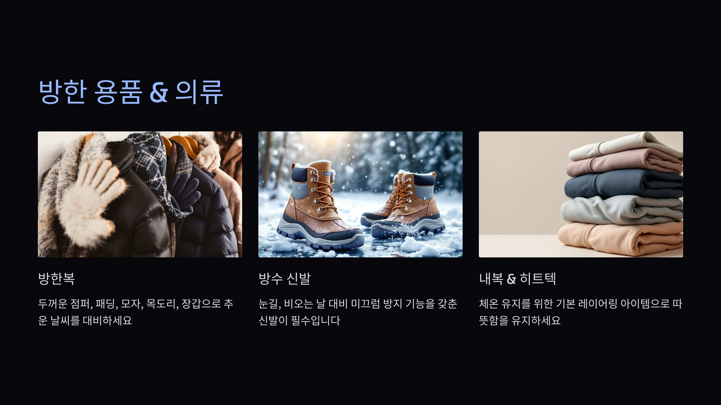 - 방한복: 두꺼운 점퍼, 패딩, 모자, 목도리, 장갑