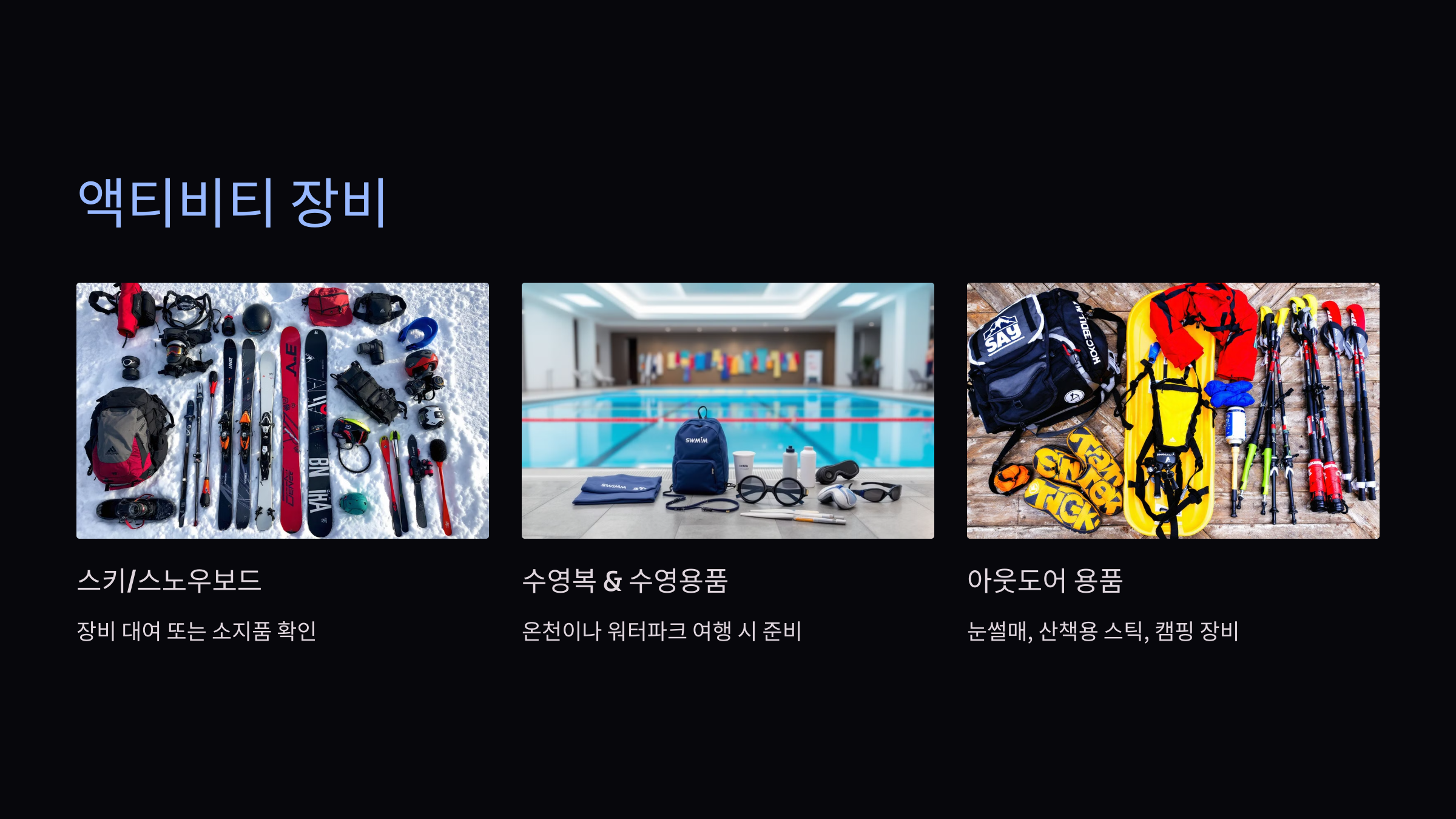 "여행지 활동에 필요한 장비를 잊지 마세요!"