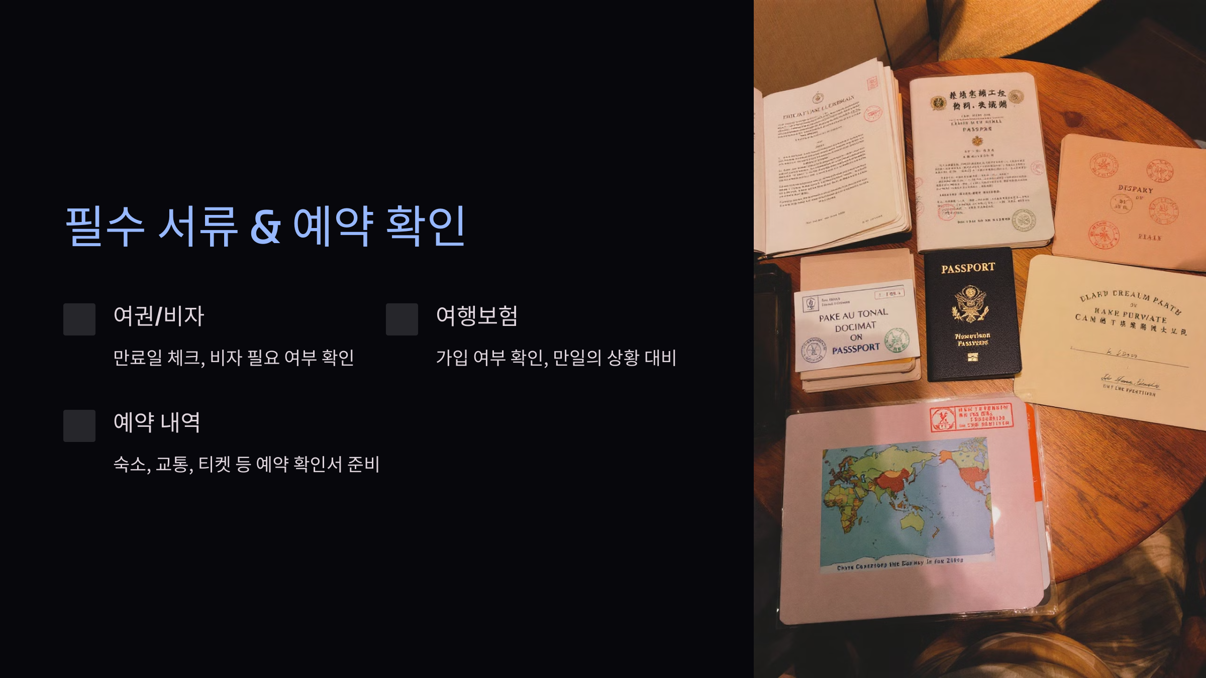 - 여권/비자: 해외여행의 경우 여권 만료일과 비자 필요 여부를 체크하세요.