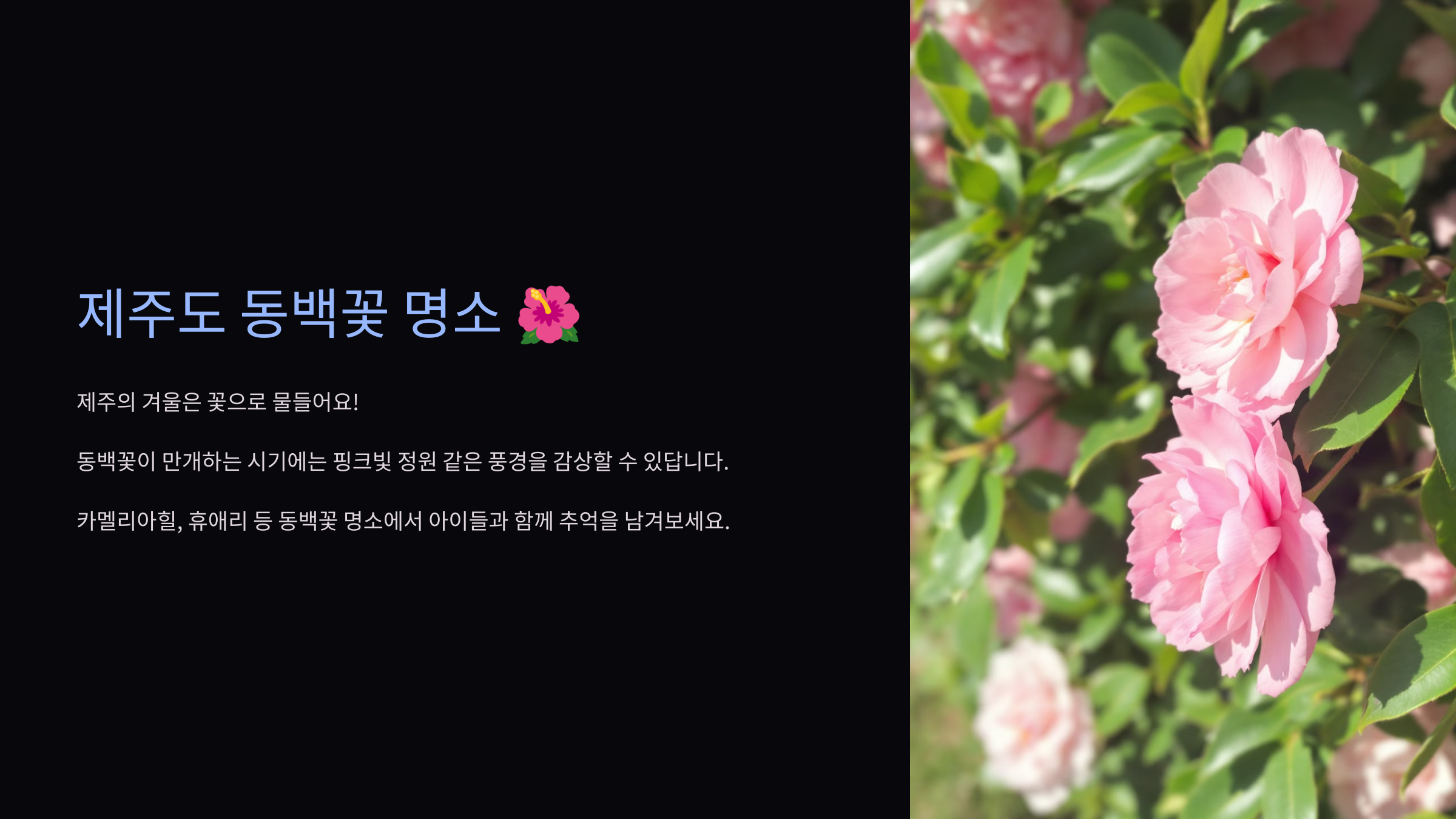 제주도는 겨울에도 매력적인 여행지입니다. 특히 동백꽃이 만개하는 시기에는 핑크빛 정원 같은 풍경을 감상할 수 있답니다. 카멜리아힐, 휴애리 등 동백꽃 명소에서 아이들과 함께 추억을 남겨보세요.