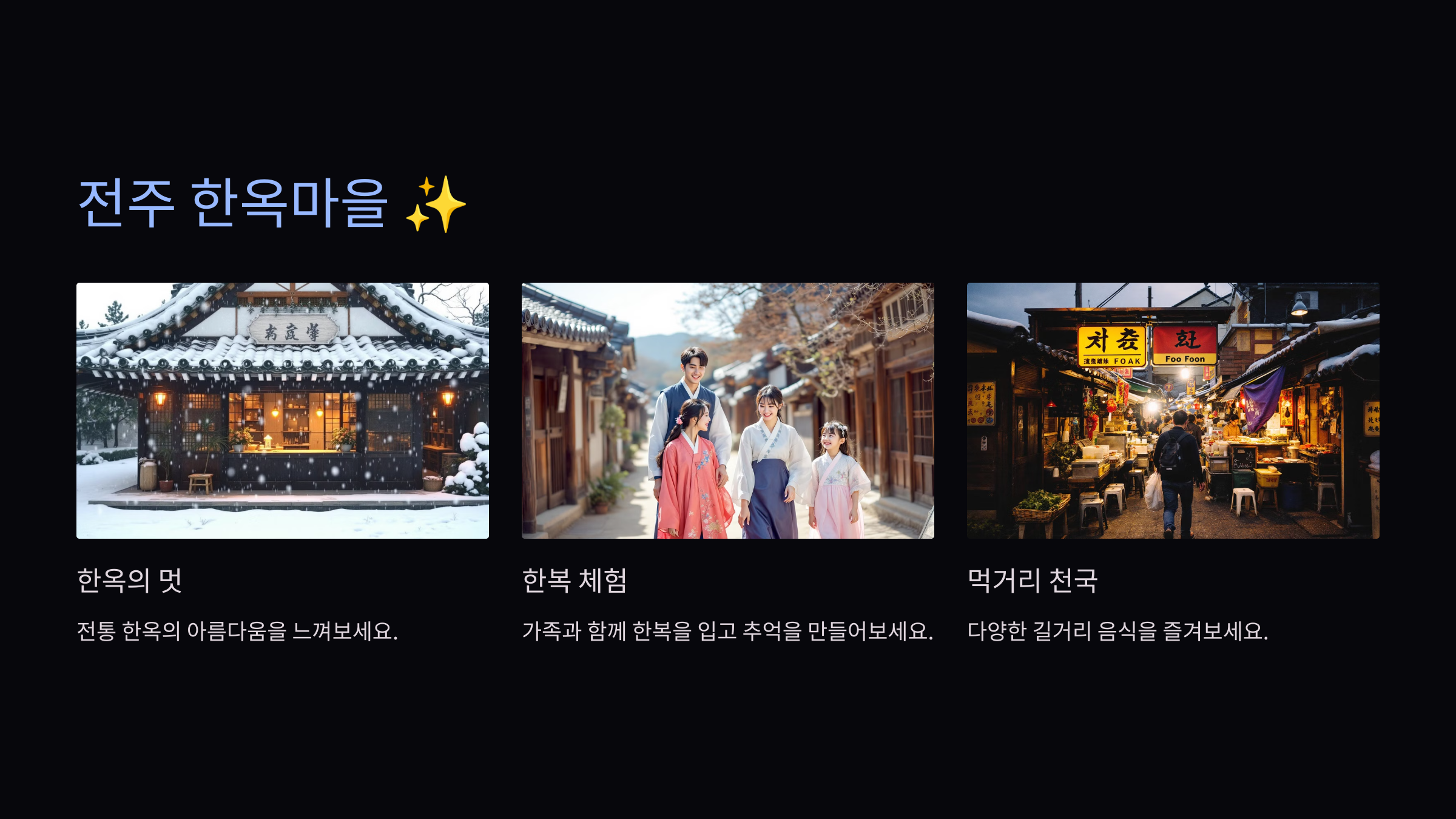 전주는 겨울에도 따뜻한 분위기를 느낄 수 있는 곳입니다. 전주 한옥마을에서 전통 한복 체험을 하고, 길거리 음식을 먹으며 가족 여행의 재미를 더해보세요!