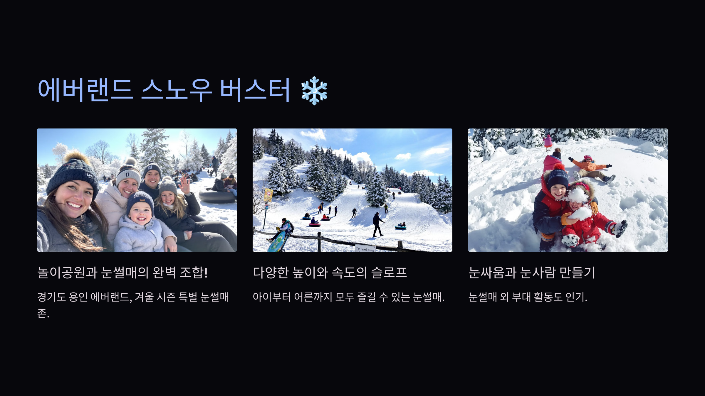경기도 용인의 에버랜드는 겨울 시즌에 스노우 버스터라는 특별한 눈썰매 존을 운영합니다. 다양한 높이와 속도의 슬로프로 아이부터 어른까지 모두 즐길 수 있어요. 눈싸움과 눈사람 만들기 같은 부대 활동도 인기랍니다.
