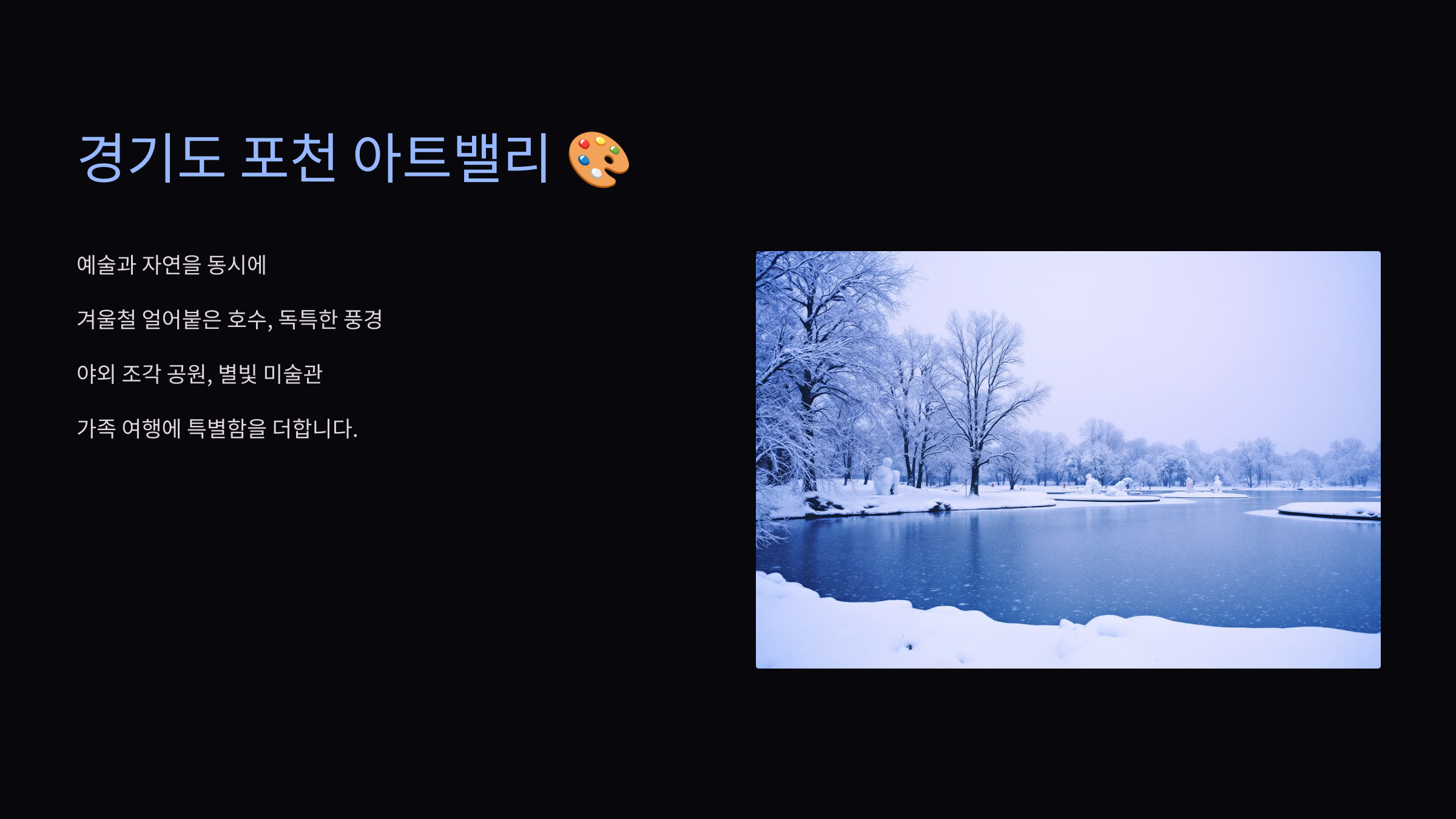 포천 아트밸리는 겨울철 얼어붙은 호수가 독특한 풍경을 선사합니다. 야외 조각 공원과 별빛 미술관 등 예술적인 요소가 가득해 가족 여행에 특별함을 더합니다.