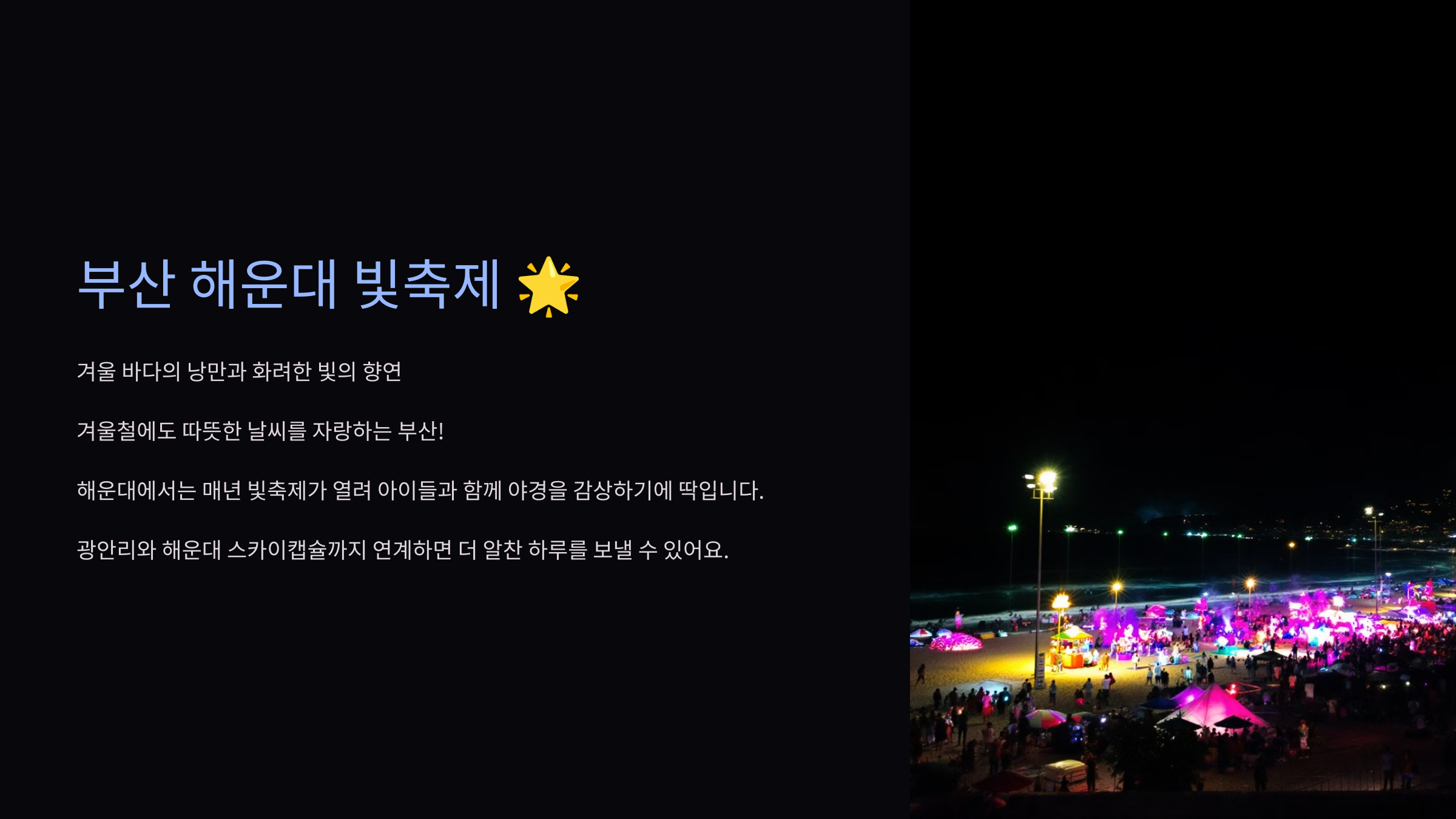 겨울철에도 따뜻한 날씨를 자랑하는 부산! 해운대에서는 매년 빛축제가 열려 아이들과 함께 야경을 감상하기에 딱입니다. 광안리와 해운대 스카이캡슐까지 연계하면 더 알찬 하루를 보낼 수 있어요.