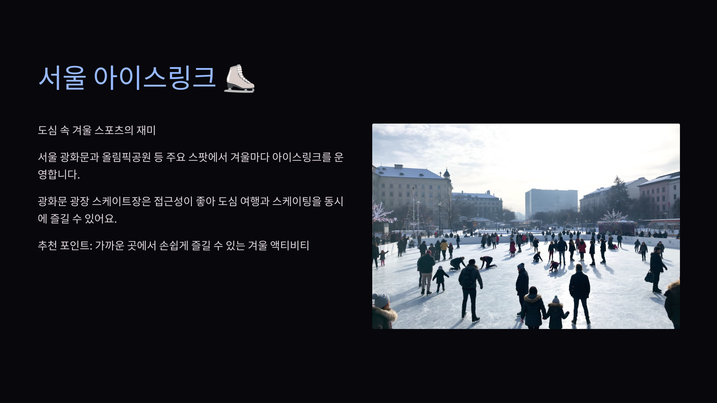 서울 광화문과 올림픽공원 등 주요 스팟에서 겨울마다 아이스링크를 운영합니다. 특히 광화문 광장 스케이트장은 접근성이 좋아 도심 여행과 스케이팅을 동시에 즐길 수 있어요.