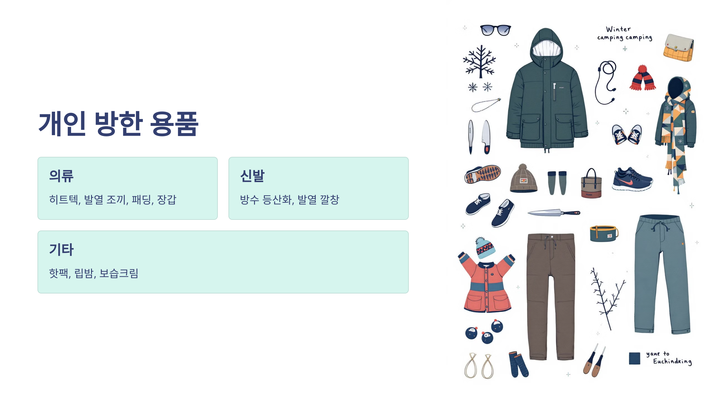 • 의류: 히트텍, 발열 조끼, 두꺼운 패딩, 방수 장갑, 목도리