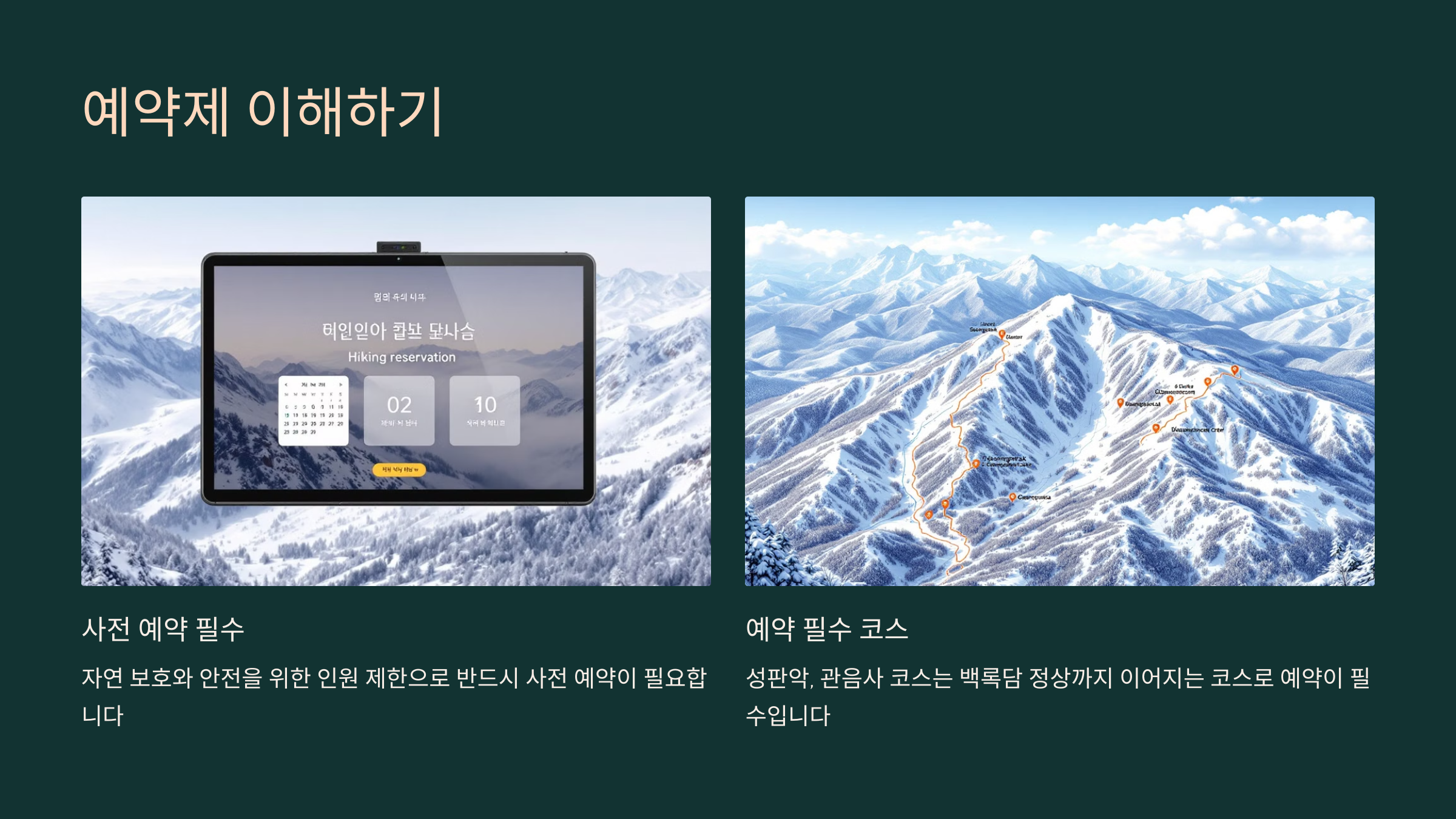 - 기상 상황 확인 필수: 눈보라 등으로 탐방이 제한될 수 있으니, 전날 기상 상황을 확인하세요.