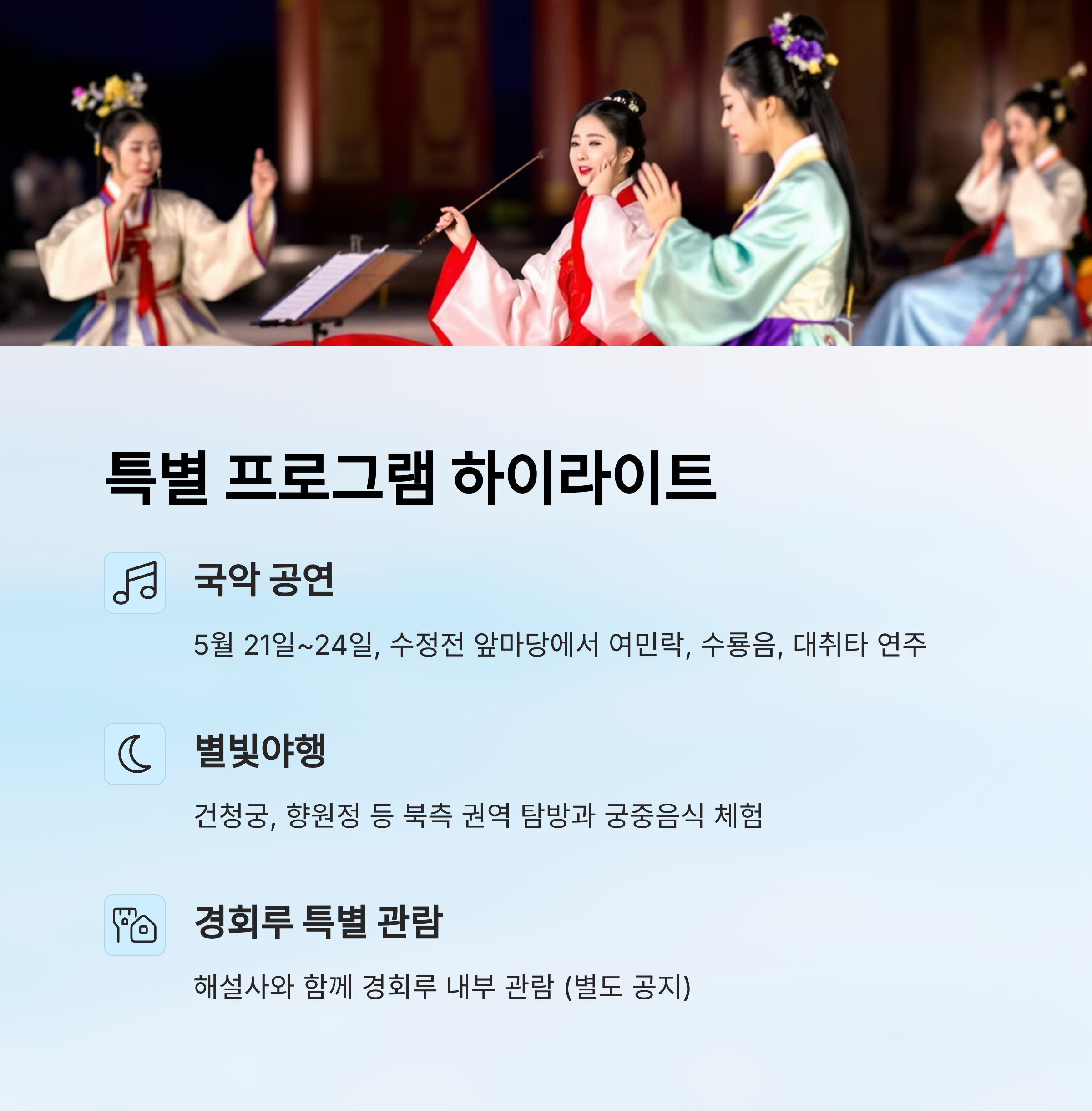 | 국악 공연 | 궁중음악 연주(여민락 등) | 5월 21일~24일 | 현장 관람 |