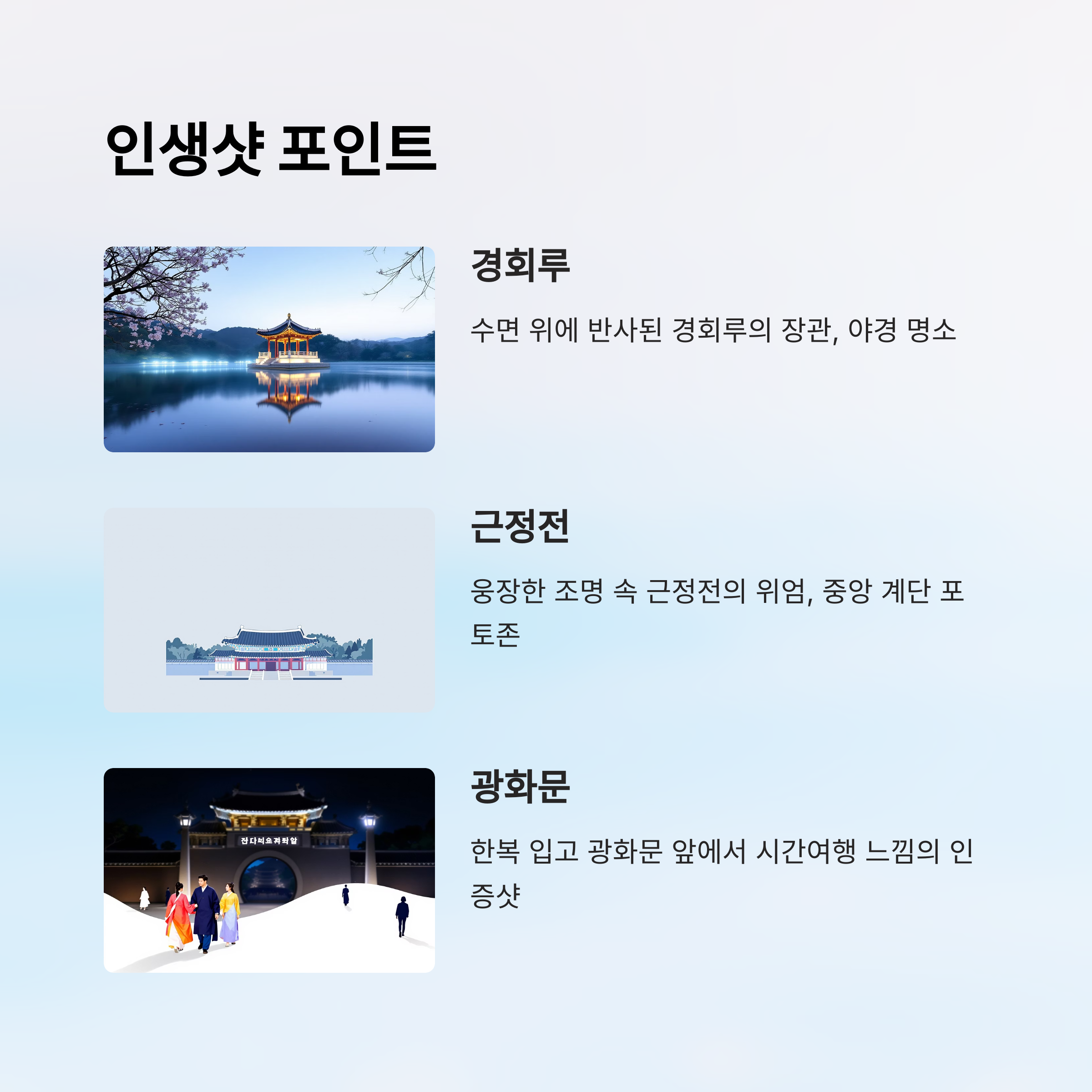 야간에는 조명이 낮게 깔려 있어서 어둠 속에서도 고궁의 윤곽이 선명하게 드러나요. 특히 사진을 좋아하는 사람들에게는 최고의 출사지이기도 해요. SNS 인증샷을 위한 핫스폿이 많아서 인생샷 건지기 딱 좋아요 📷