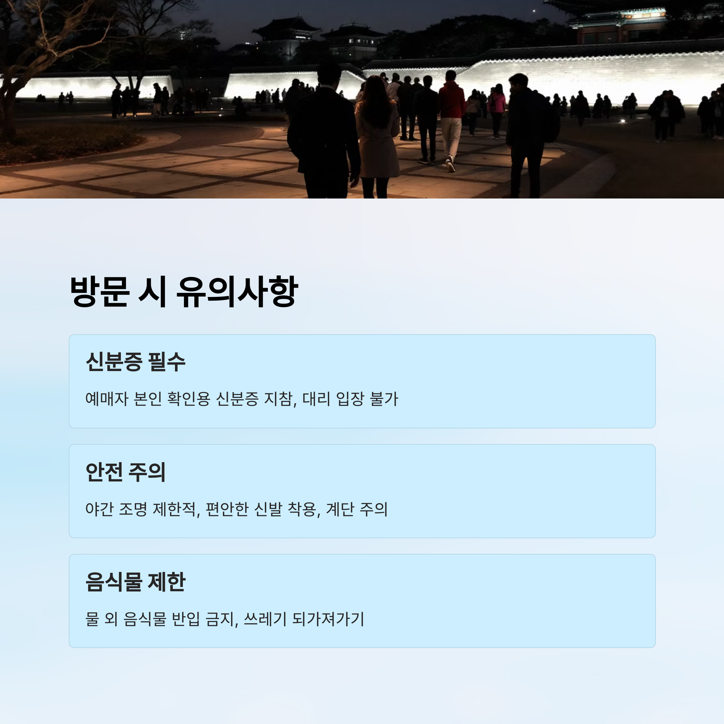 경복궁 야간관람은 아름다운 문화 체험이지만, 문화재 보호와 관람객 안전을 위해 지켜야 할 주의사항이 있어요. 특히 야간에는 시야가 어두운 만큼 사소한 부주의가 큰 사고로 이어질 수 있으니 꼼꼼히 확인해두는 게 좋아요.