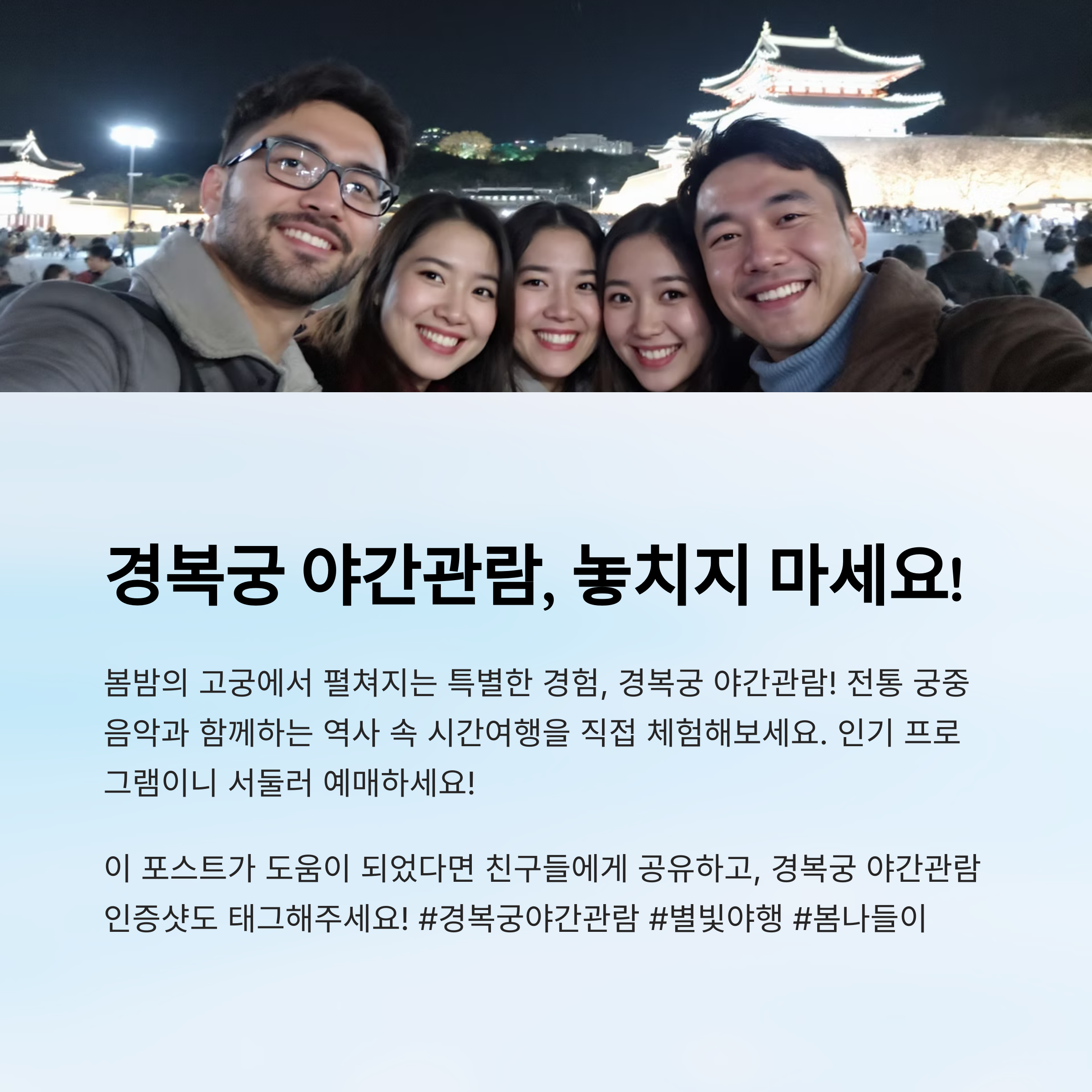 결론적으로, 야간관람은 자유롭게 고궁을 즐기고 싶은 분에게, 별빛야행은 해설과 체험 중심의 깊이 있는 역사 여행을 원하는 분에게 추천돼요. 어떤 프로그램이든 각자의 매력이 확실하니 본인의 여행 스타일에 따라 골라보면 좋아요 🌠