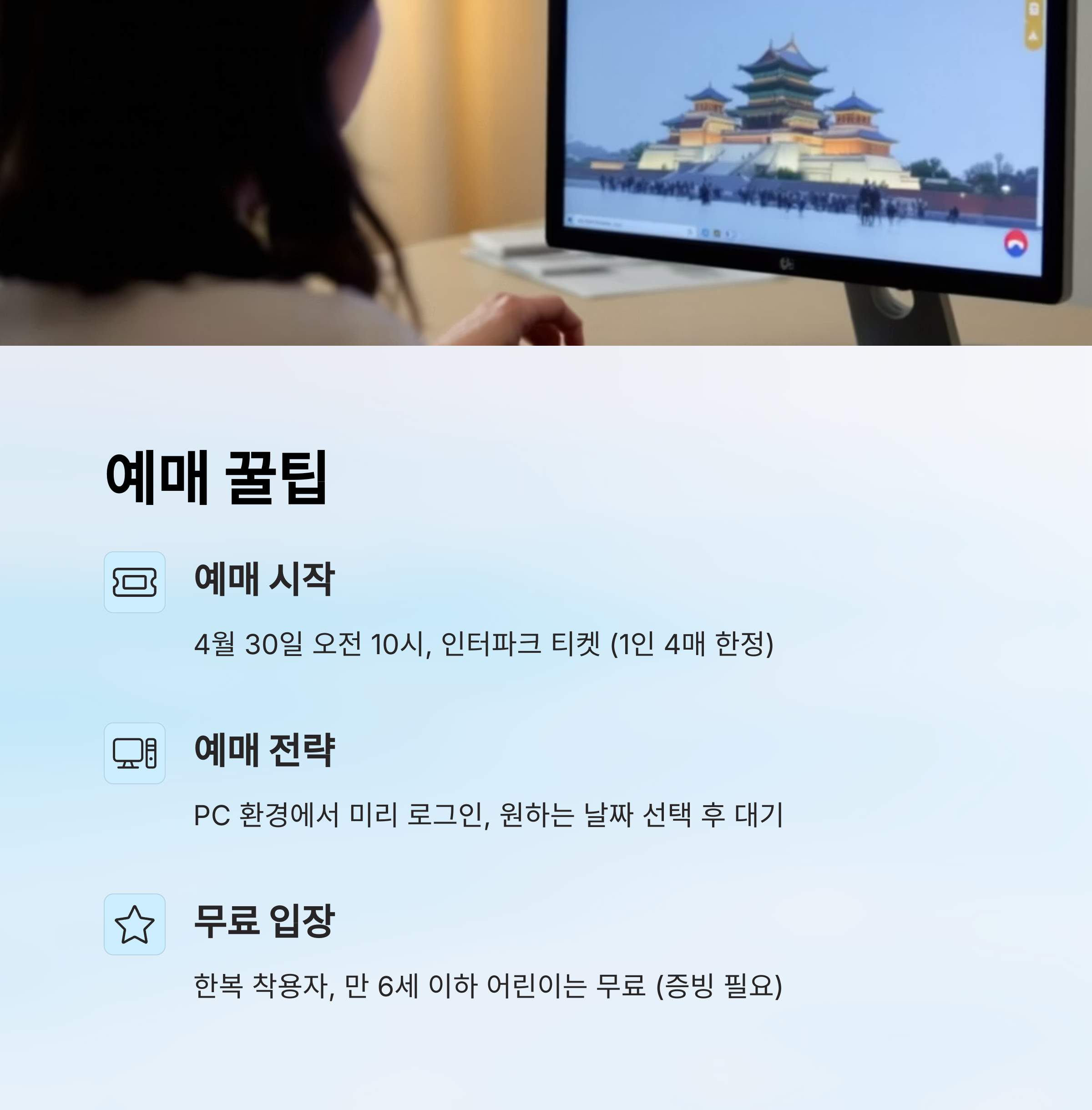 무료입장 대상자도 있어요. 만 6세 이하의 어린이와 한복을 착용한 사람은 별도의 예매 없이 입장이 가능해요. 단, 한복 착용자는 지정된 기준(전통 또는 개량한복 형태)을 충족해야 하며, 현장에서 직원의 확인을 받아야 해요 👘