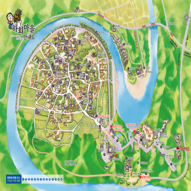 안동 하회마을은 관광지로 생각되어 인공적으로 조성된 마을이 아닌가 하고 생각하시는 분이 많으실 텐데, 이곳은 600여 년간 마들 사람들이 터전을 잡고 살아온 자연마을입니다. 현재도 150여 가구의 마을 사람들이 이곳에서 실제로 생활하고 있습니다. 우리나라의 전통적인 유교문화와 역사가 살아 숨 쉬는 곳으로 2010년에 유네스크 세계유산으로 지정되었습니다. 위치는 경북 안동시 풍천면에 있습니다. 관람요금은 어른 5,000원 청소년 2,500원 어린이 1,500원입니다. 6세 이하 또는 65세 이상은 무료입니다. 관람시간은 동절기에는 9시~16시 30분에 입장 마감을 합니다. 매표소에서 표를 구매 후 100m 정도 걸어가면 검표소가 있는데 이곳에서 마을입구까지 셔틀버스를 타고 가거나 아니면 15분 정도 걸어가면 됩니다. 버스는 10분마다 운행됩니다. 마을을 관람하는 데는 도보로 90분 정도 소요됩니다. 꼭 보아야 할 공연이 있는데 하회별신굿탈놀이 공연입니다. 1월~2월에는 주말에 14시~15시에 탈춤전수관에서 공연을 하기 때문에 가능하면 시간을 맞추어 가시는 것을 추천드립니다. 이곳은 씨족 마을로 김해 허 씨, 광주 안 씨, 풍산 류 씨가 모여 살던 곳으로 한국의 미가 그대로 남아있는 고택 마을입니다. 높은 담으로 둘러싸인 기와집과 그 주변을 둘러싸고 있는 초가집들이 한데 어우러져 마을을 이루고 있으며, 옛날 그대로의 모습이기 때문에 안내지도를 참고해서 관람하시는 것이 좋습니다. 길이 구불구불 연결되어 있어 잘못하면 길을 잃고 헤매실 수 있습니다. 주민들이 살고 있는 곳이라 집 안으로 들어갈 수는 없지만 화수당, 충효당 등과 같이 개방되어 있는 곳은 안에 들어가 볼 수 있습니다. 마을의 한가운데에는 600년 이상 이 마을을 지켜온 큰 나무가 있는데 이곳이 삼신당이라는 곳입니다. 주민들이 성스럽게 생각하는 나무로 소원을 비는 곳입니다. 정월대보름날에는 이곳에서 제사를 지낸다고 합니다. 영국 엘리자베스 여왕의 방문 기념관도 있습니다. 마을을 둘러싸고 흐르는 하천의 건너편에는 류성룡의 형이 만 그루의 소나무를 심었다는 만송정이 있는데 천연기념물 473호로 지정되어 있습니다. 또 하회마을에는 길 옆으로 나란히 서있는 벚꽃나무가 터널처럼 되어 있는 곳이 있는데 봄이 되면 벚꽃을 피워 벚꽃터널로 변하여 많은 사람들이 찾고 있습니다. 우리나라 고유의 마을 모습을 보고 싶으신 분들을 위해 추천합니다.