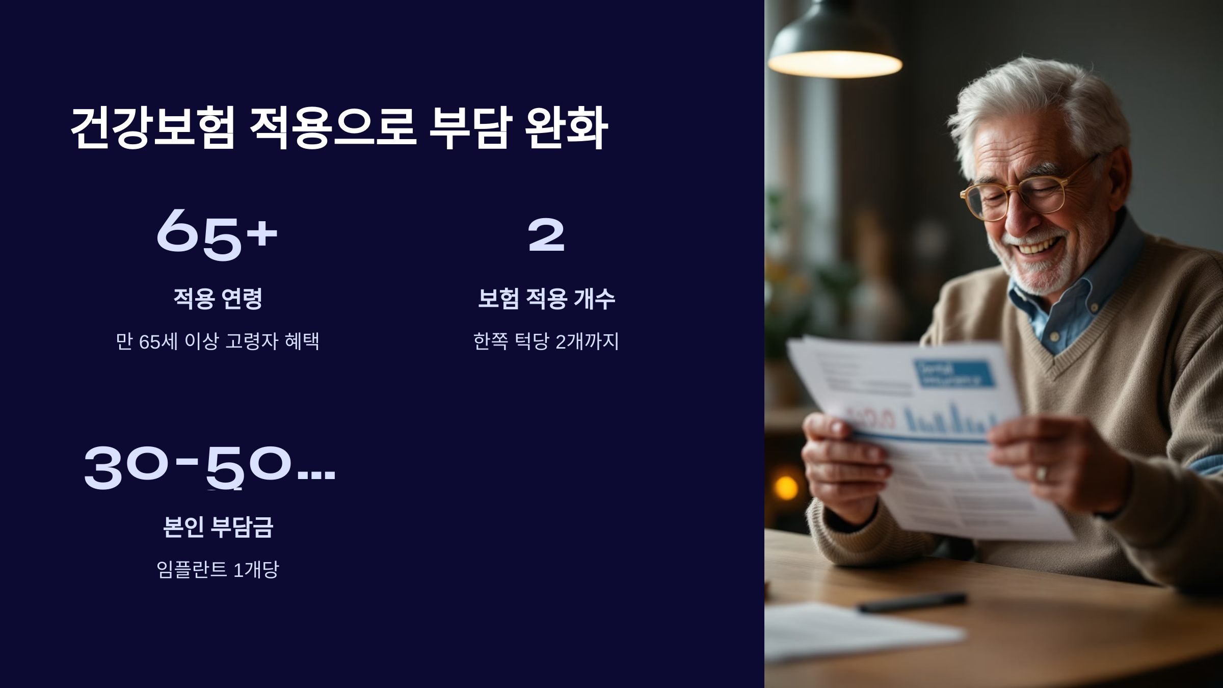 - 본인 부담금: 임플란트 1개당 약 30만 원~50만 원 수준으로 감소