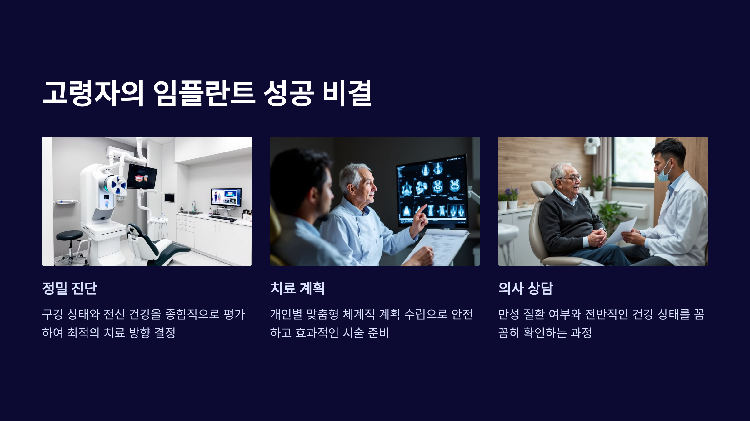 고령자가 임플란트를 성공적으로 시술받기 위해서는 몇 가지 중요한 요소를 꼭 기억해야 합니다.