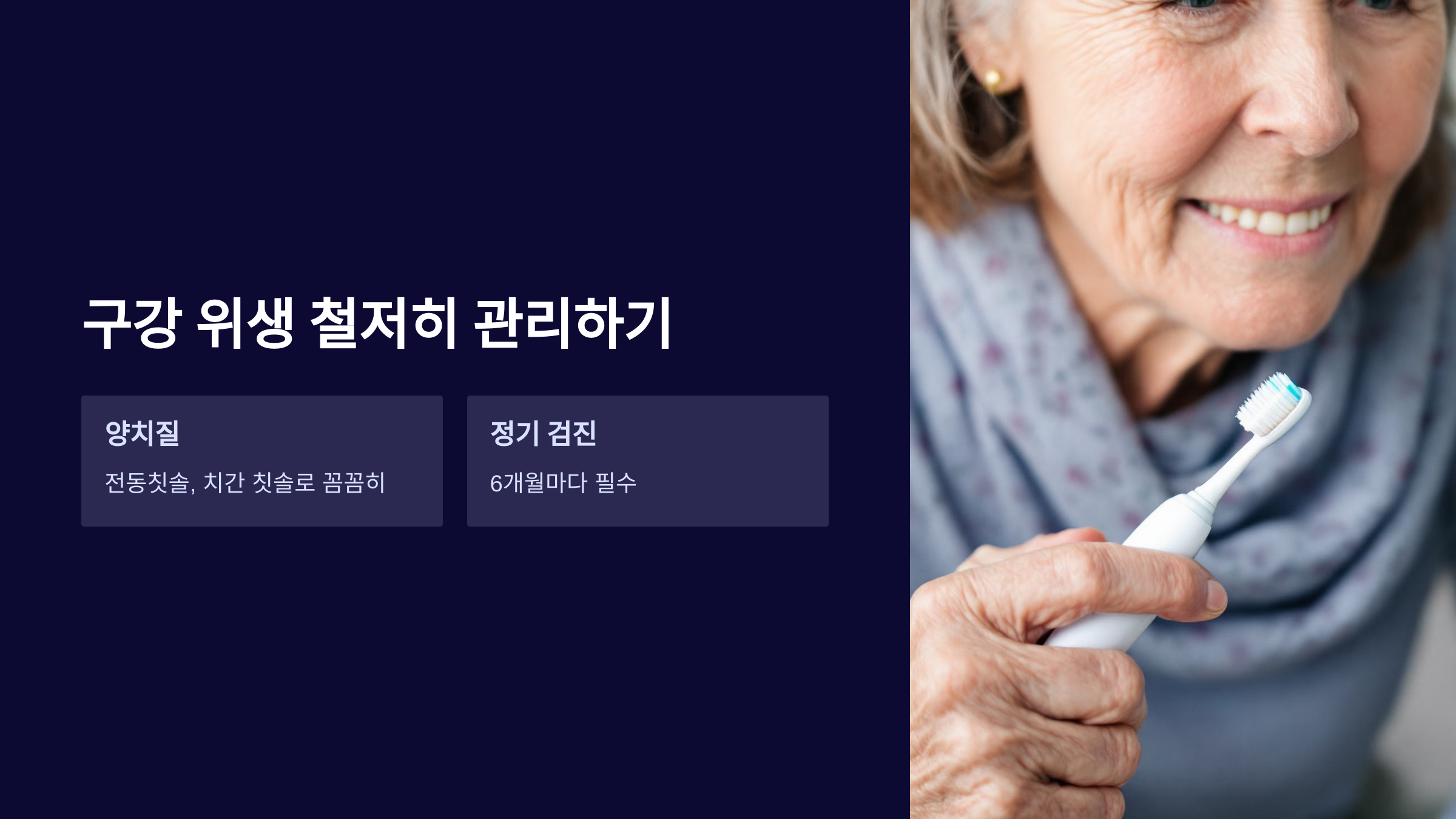 - 올바른 식습관 유지: 너무 딱딱하거나 질긴 음식은 피하고, 부드럽고 영양가 높은 식사를 하세요.