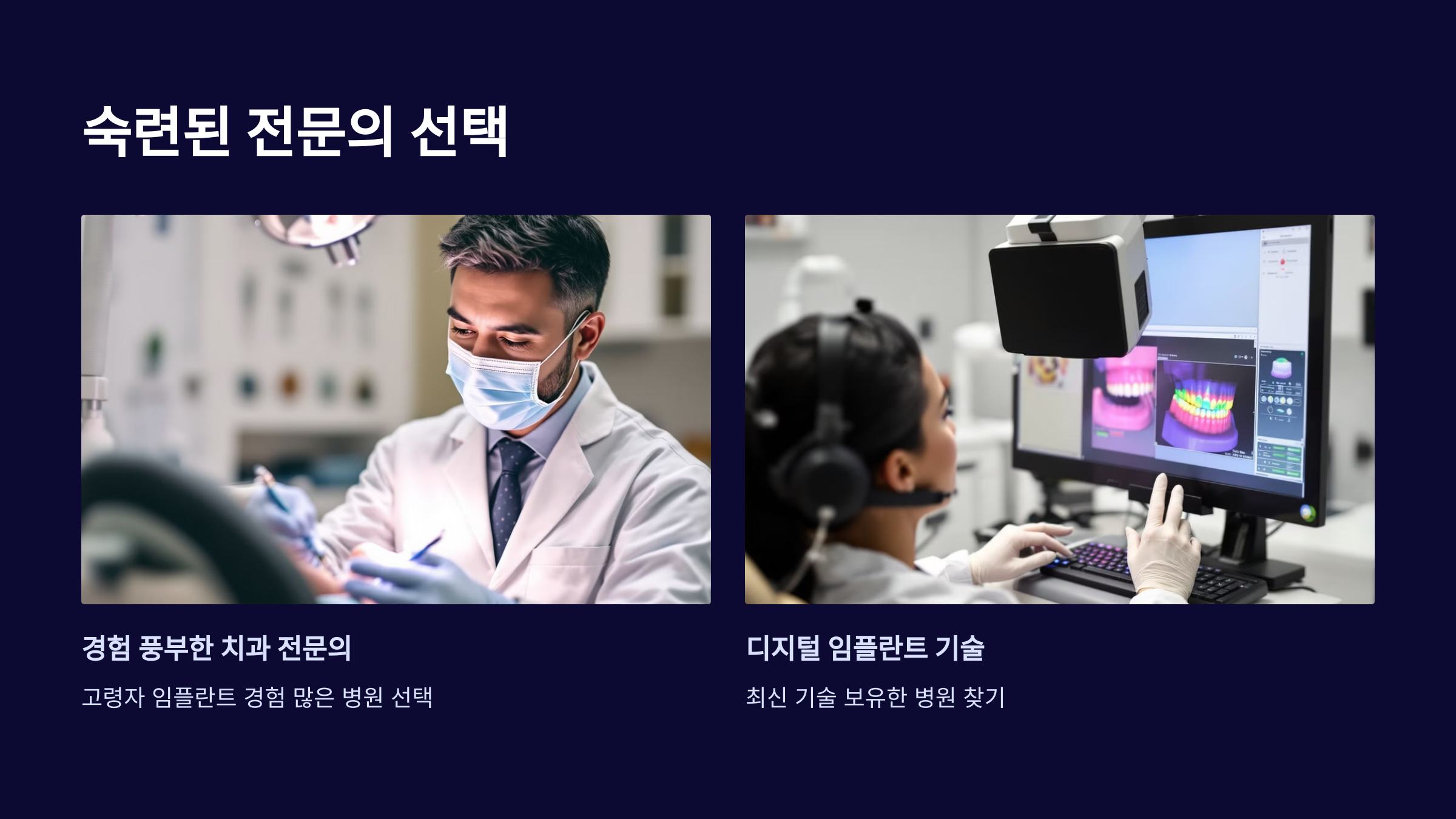 - 고령자 임플란트 경험이 많은 병원을 선택하면 성공률이 높아집니다.