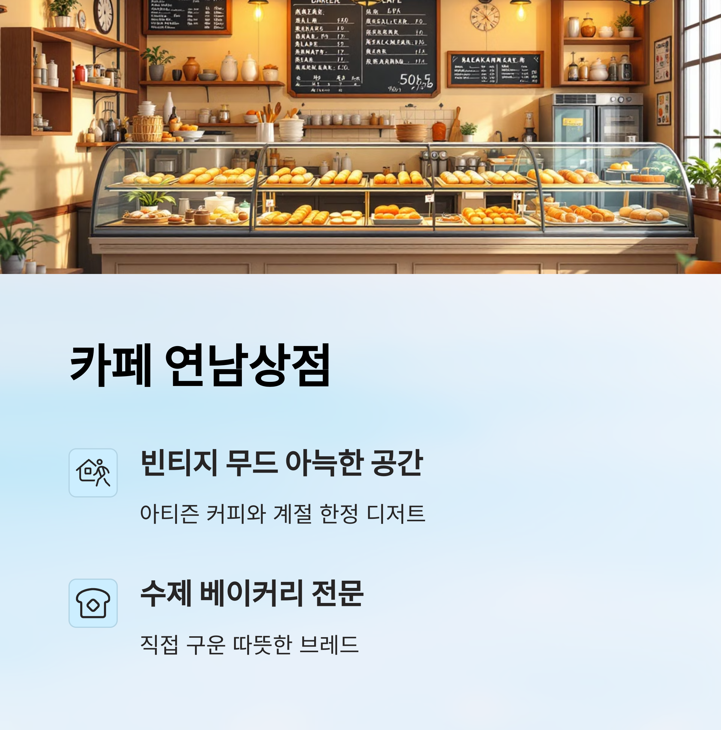 연남동 감성을 그대로 옮겨온 듯한 공간! 따뜻한 조명과 내추럴한 우드톤 인테리어가 포근한 분위기를 만들어줘요. 무엇보다 디저트 플레이팅이 너무 예뻐서 사진 찍기 정말 좋아요📸
