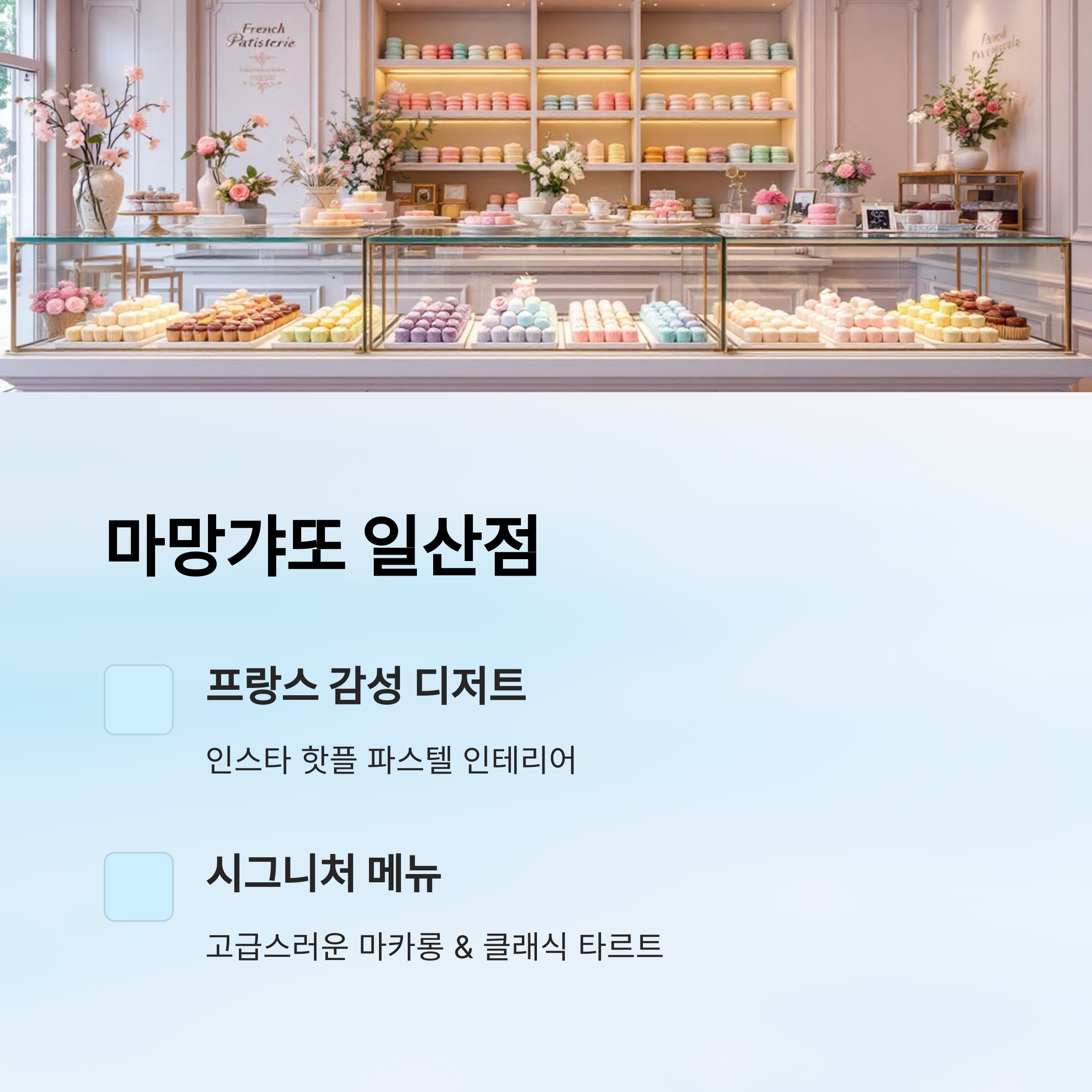 고양 호수공원 앞 라페스타 단지 안쪽에 위치한 디저트 전문 카페예요. 프랑스풍 정통 파티셰 스타일 케이크가 인기 많은 곳이에요. 깔끔한 화이트톤 인테리어와 유럽풍 테이블 세팅이 봄 햇살과 너무 잘 어울려요🌸