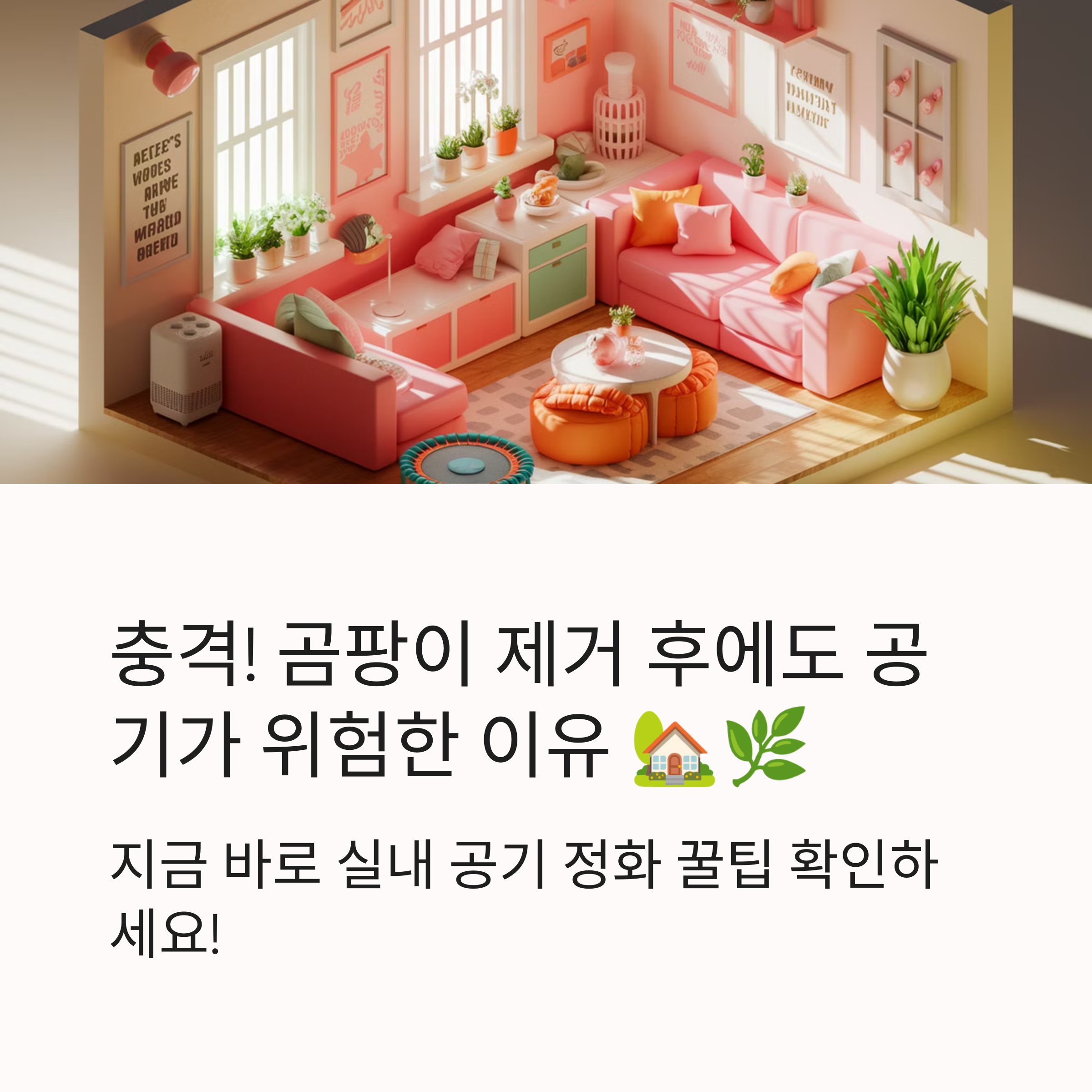 "곰팡이를 제거해도 실내 공기가 탁하고 찝찝한 느낌이 들어요! 😷" **곰팡이는 공기 중에 포자를 퍼뜨리면서 실내 환경을 오염시킬 수 있어요.** 특히 호흡기 건강에 영향을 줄 수 있기 때문에 **제거 후 공기 정화까지 해야 완벽한 해결!** 지금부터 **곰팡이 제거 후 실내 공기를 깨끗하게 정화하는 꿀팁**을 알려드릴게요. ✅