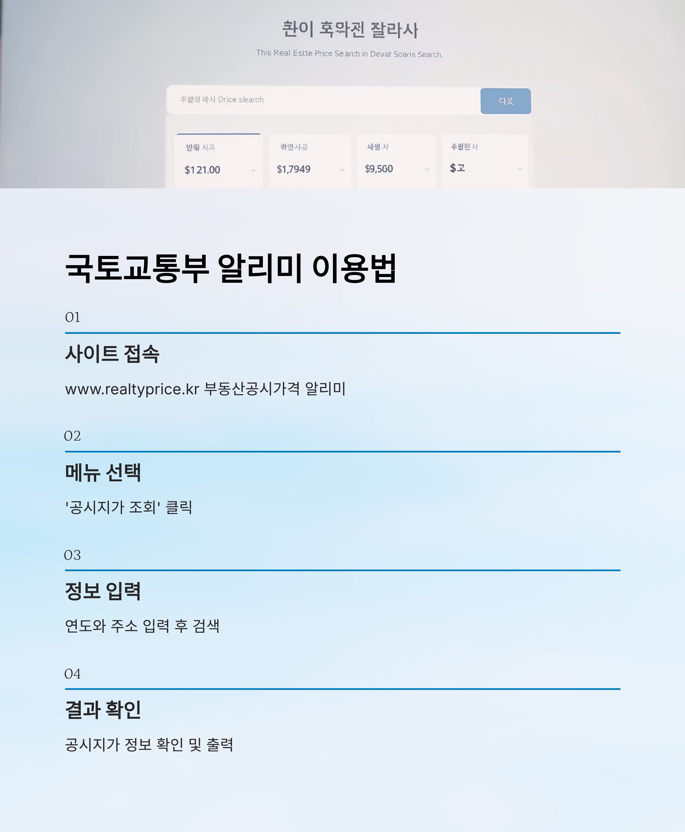 공시지가를 가장 빠르고 정확하게 확인할 수 있는 방법 중 하나는 국토교통부의 공식 포털인 ‘부동산공시가격 알리미(www.realtyprice.kr)’를 이용하는 거예요. 이 사이트는 표준지와 개별공시지가 모두를 확인할 수 있는 공공 서비스로, 누구나 무료로 사용할 수 있어요.
